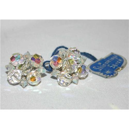 These Gorgeous Vintage Cut Glass Aurora Borealis clip back Earrings are SIGNED Coro and were made in the early 1940s. Complete with their original hang tag Shimmering Stars. There are 5 large and 4 small Glass Aurora Borealis set in a circular fashion, measuring 1 inch in diameter. Set on a silver Rhodium plated filigree backing. Just beautiful! These Gorgeous Coro Glass Aurora Borealis Earrings signed Coro.