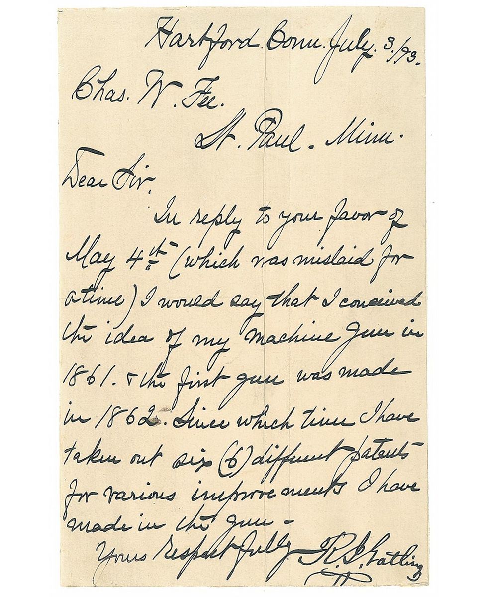 Measuring 5 3/4 wide and 8 7/8 inches long, this letter is fully hand-written, with a dateline of Hartford, Connecticut, July 3rd 1893, and addressed to a Charles W. Fee of Saint Paul, Minnesota. The letter reads "Dear Sir,/In reply to your favor of/May 4th (which was mislaid for/a time) I would say that I conceived/the idea of my machine gun in/1861. The first gun was made in 1862. Since which time I have/taken out six (6) different patents/for various improvements I have/made in the gun./ Yours Respectfully R.J. Gatling". Born in 1821, Gatling was chiefly an inventor of agricultural equipment, his main focus in life despite years spent as a dry goods merchant and the acquisition of a medical degree. He developed his signature gun at the beginning of the Civil War, believing that a machine that could do the job of a volley-firing infantry unit would reduce the number of men sent into the field, and in turn reduce the number of casualties from infectious diseases. Among the six patents mentioned in the letter is one covering a Gatling Gun with an electric drive motor; this combination never caught on in Gatling's lifetime, but would become the de-facto standard for anti-aircraft machine guns following the rise of the jet aeroplane.
