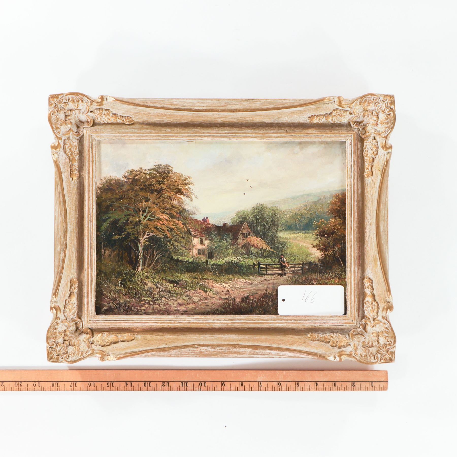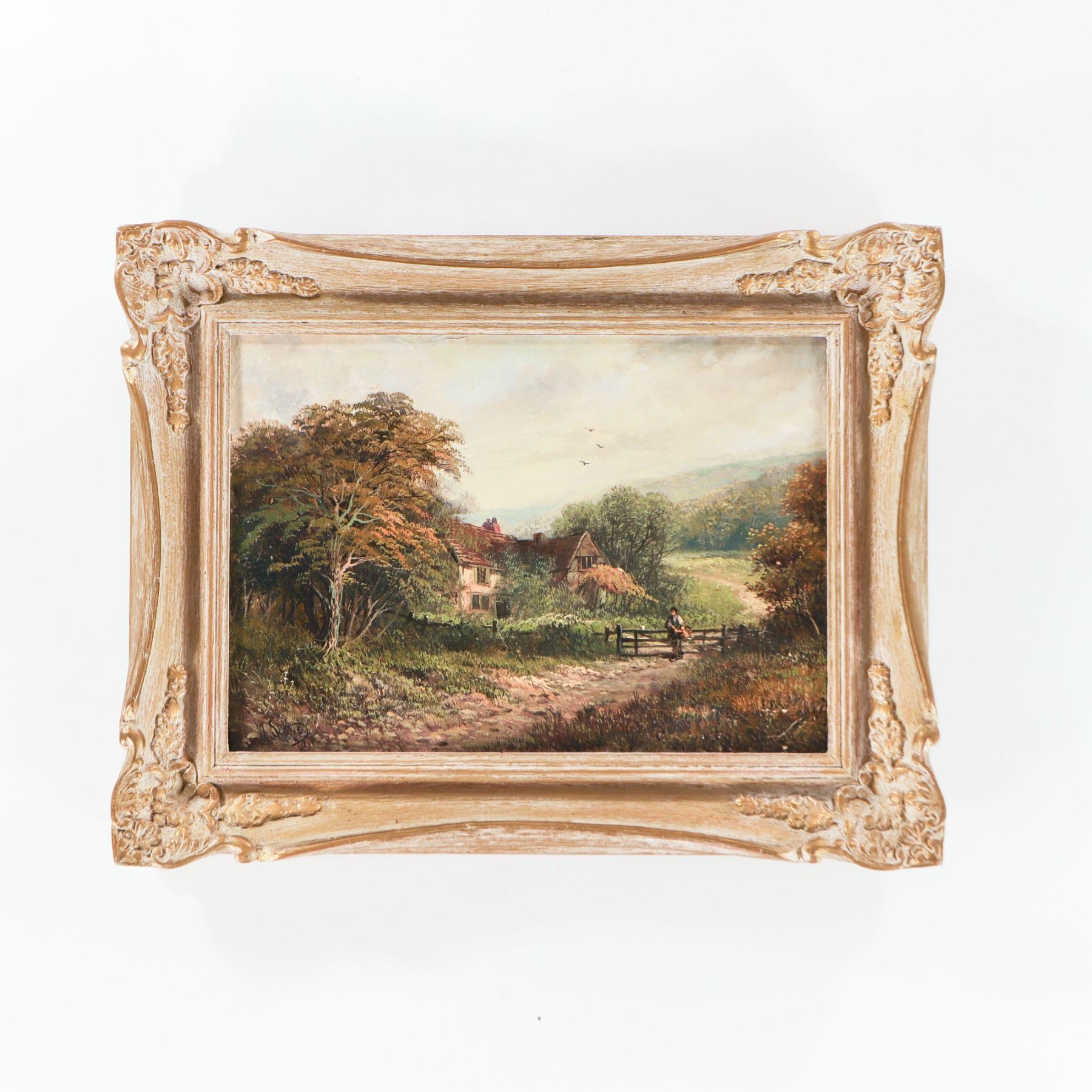 Signed oil landscape, likely mid-20th century, depicting a country lane leading past a gate toward a thatched or tile-roofed cottage nestled among trees, with gentle hills and soft sky beyond; a lone figure stands by the gate, adding scale to the scene. Signed at the lower left (indistinct). Presented in an ornate cream and gilt-tinted rococo-style frame with molded scroll and foliate corners. Overall frame dimensions approx. 18 in. wide x 14 in. high.