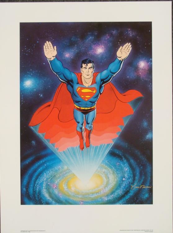 Straight from another another dimension right to your living room, it's Superman and he's yours for the taking.Artist: Curt Swan Medium: Lithograph print on paper Signature: lower right, in gold sharpie Size of Image: 13 1/8" x 18 1/4" Size of Paper: 17 1/8" x 23 1/4" Publication: First Team Press, Inc Date: 1988 Condition: Excellent BiographyDouglas Curtis Swan (February 17, 1920, in Willmar, Minnesota - June 17, 1996) was an American comic book artist. The artist most associated with Superman during the period fans and historians call the Silver Age of comic books, Swan produced hundreds of covers and stories from the 1950s through the 1980s.Initially, Swan drew many different features, including "Tommy Tomorrow" and "Gangbusters", but slowly he began gravitating towards the Superman line of books. His first job pencilling the iconic character was for Superman #51 (March-April 1948). Many comics of the 1940s and 1950s lacked contributor credits, but research shows that Swan began pencilling the Superboy comic book with its fifth issue in 1949. Swan always felt, however, that his breakthrough came when he was assigned the art duties on Superman's Pal, Jimmy Olsen, in 1954. Around 1954, Swan unsuccessfully pitched an original comic strip for newspaper syndication. Called Yellow Hair, it was about a blond boy raised by Native Americans. A couple of years later, starting with the episode of June 18, 1956, Swan drew the Superman daily newspaper comic strip, which he continued on until November 12, 1960.Information retrieved from: http://en.wikipedia.org/wiki/Curt_Swan