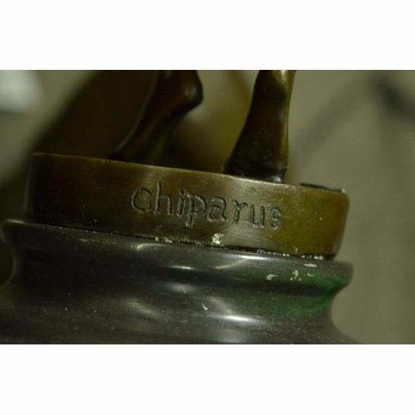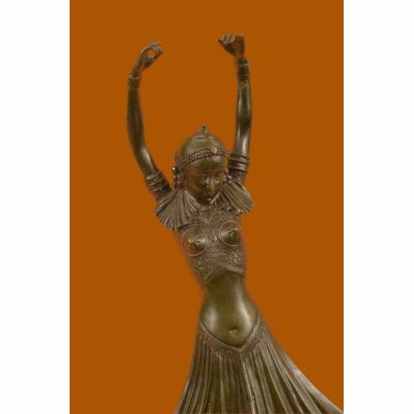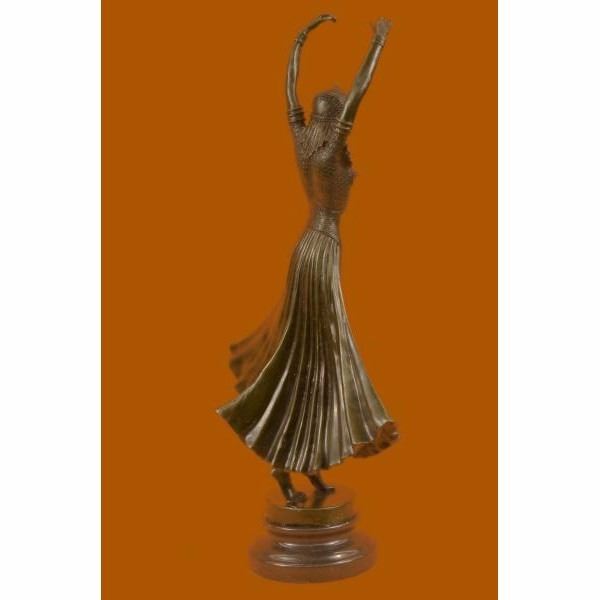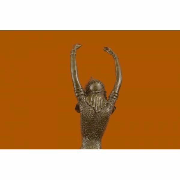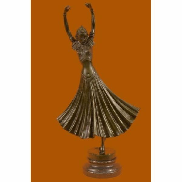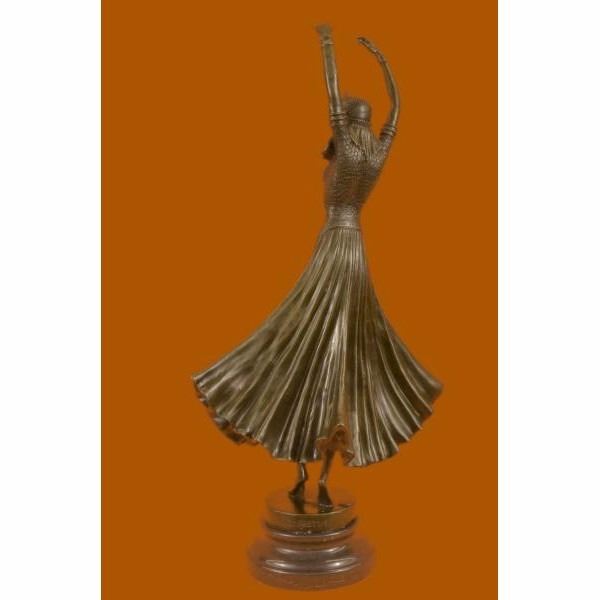 The lithe dancer balances on one leg in a graceful pose. Her other leg bends in a posse, her arms extend in a T to the side. Her long skirt raises with her leg. Studs adorn the entire costume. Taking influence from Russian and French artists, Mirval creates these wonderful sculptures of female dancers in traditional costumes. The sculpture was crafted using the lost wax method. It rests on a black marble base. It is signed Mirval. Condition : This sculpture is in perfect condition. Bronze Dimensions with Marble Base:Height 17" x Width 9" Marble Dimensions:Diameter 4 1/2" Height without base: 15" Weight :10 LBS Inventory : 61DS2024216
