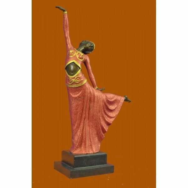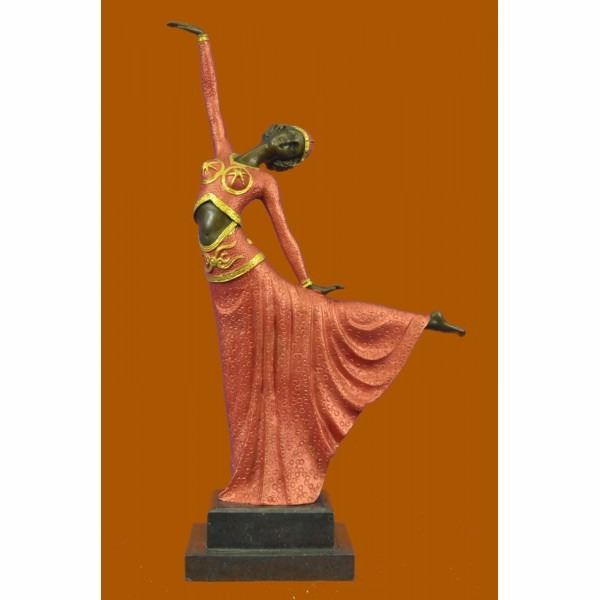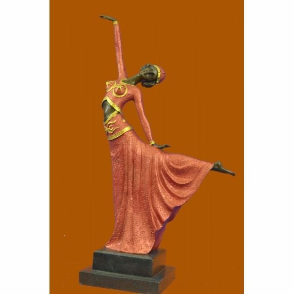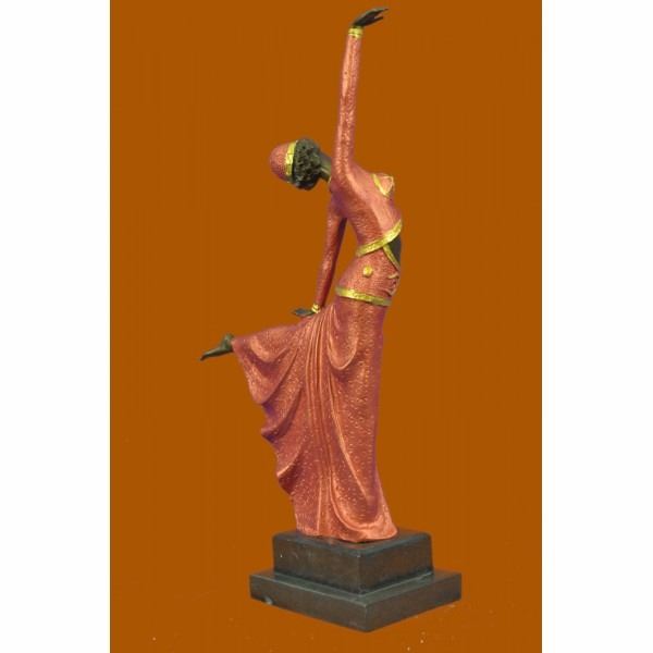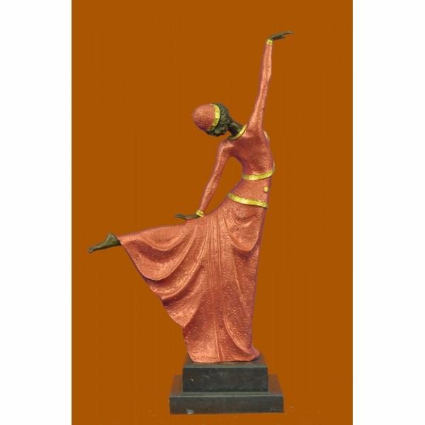 An elegant dancer extends her long leg out in an arabesque. Her long vibrant dress extends with her. She raises softly and gently to the sky. Her head tilts along with the movement. This a very beautiful piece that pays tribute to the art of dance. The sculpture stands on a black marble base. It signed by the arts D.H. Chiparus. The lost wax method was used to create this sculpture. Condition: This sculpture is in perfect condition. Bronze Dimensions with Marble Base:Height 17" x Width 13" Marble Dimensions: 5" X 4" . Height without base: 15" Weight : 9 LBS Inventory 51YRD826C5315