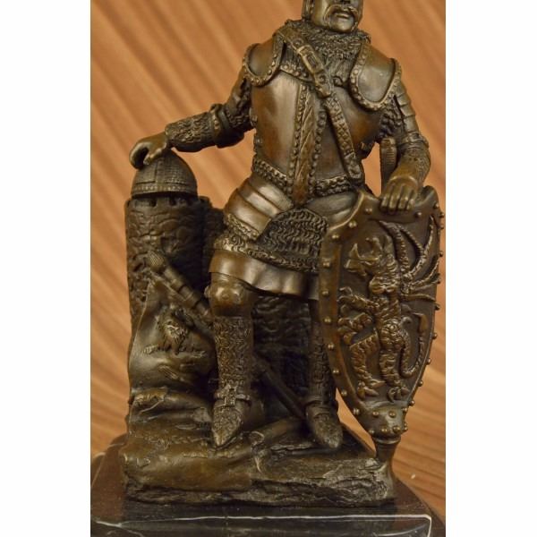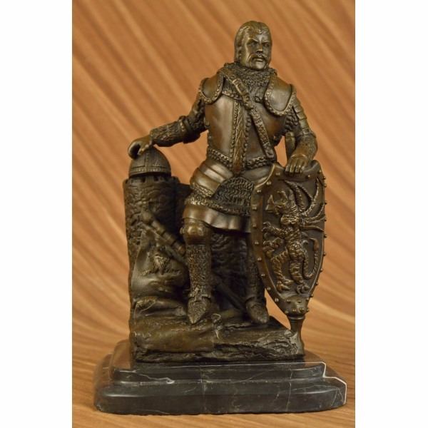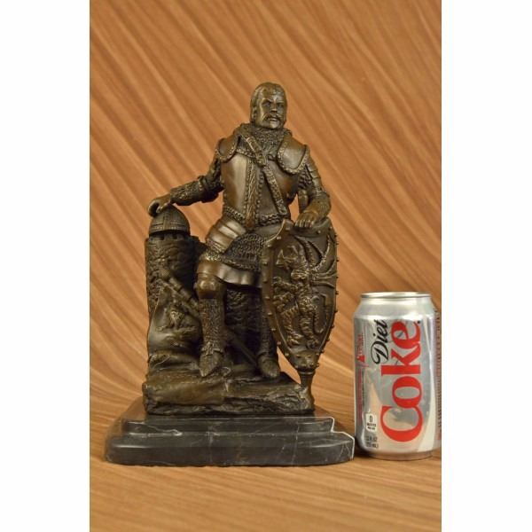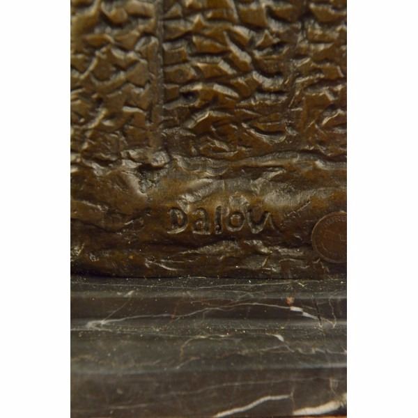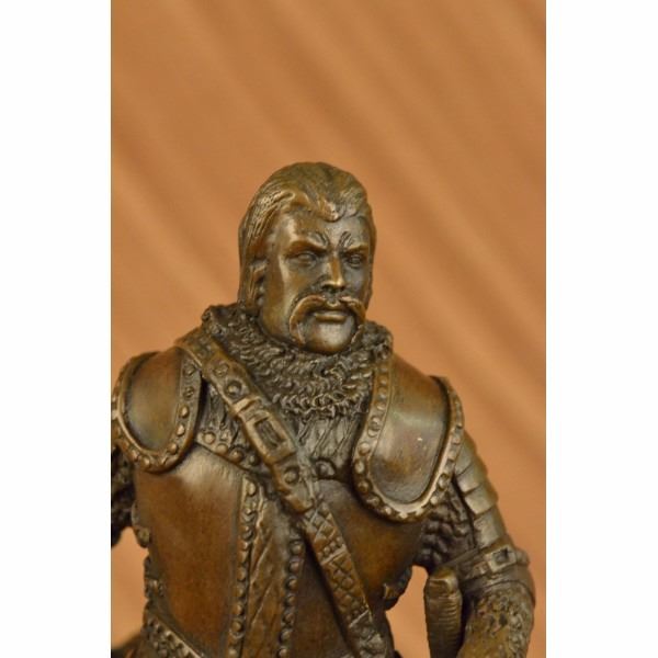 Known for their heavy armor, and powerful brute strength a Viking Huscarl gained respect among Europeans. This Norseman stands proudly digging his two-sided axe into the ground and stepping one foot a level higher in the signature pose of power and pride. Fully outfitted in armor, shoes, and a cape this warrior has all the elements of a great fighter. This 100% bronze sculpture was crafted using the lost wax method. The piece stands on a circular black marble base. It is signed Dalov. Condition : This sculpture is in perfect condition. Bronze Dimensions with Marble Base:Height 12" x Width 7" Marble Dimensions: 7" X 7". Height without base: 11" Weight : 14 LBS Inventory:64DS43046