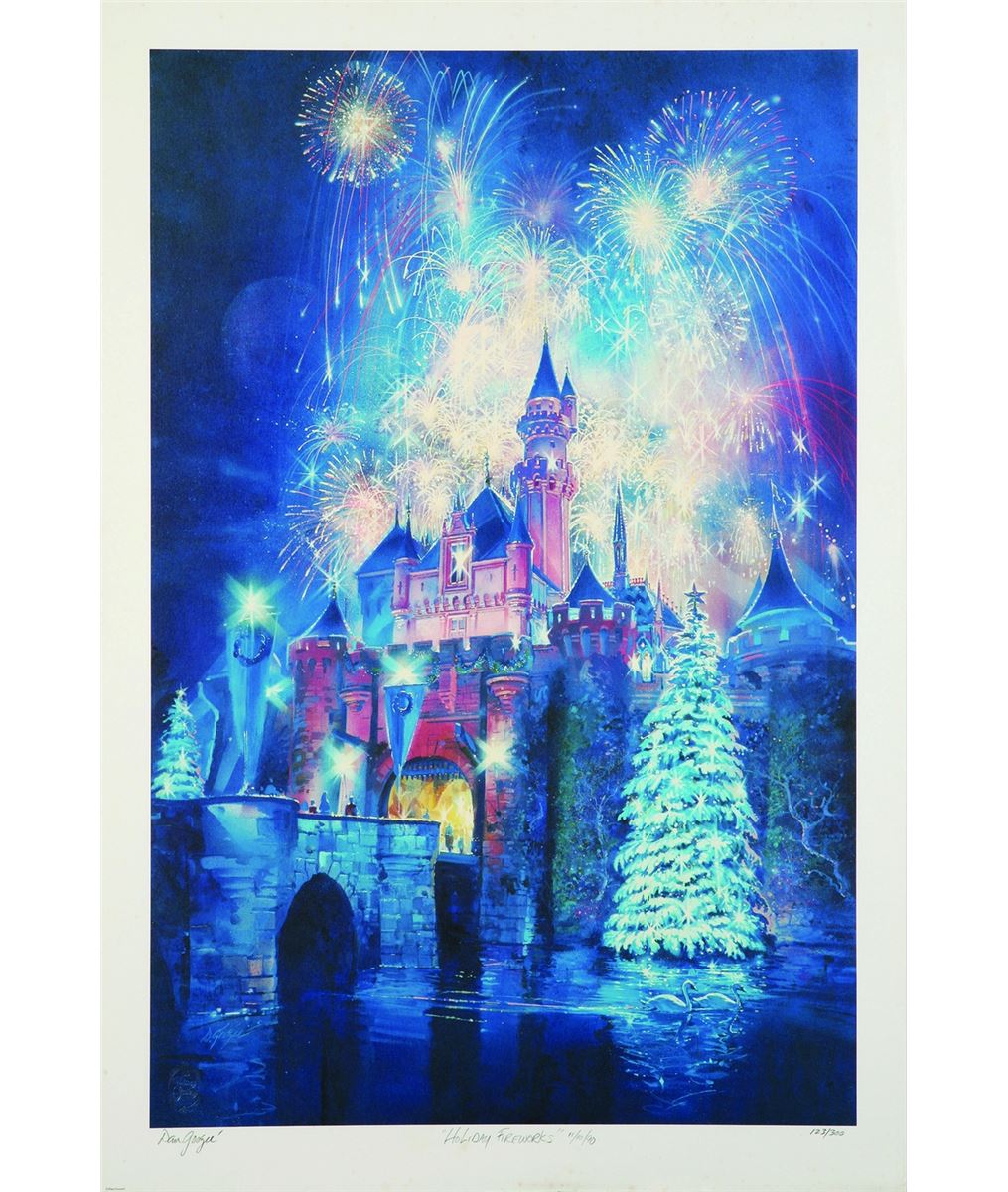 (Disney Gallery, 1990s) Signed "Holiday Fireworks" Lithograph, by Dan George. The lithograph was released in an edition of only 300 pieces. Numbered 123/300, and measuring 35"x24". Fair condition with extensive foxing that does not affect the image. Minor creasing in top and lower margins.
