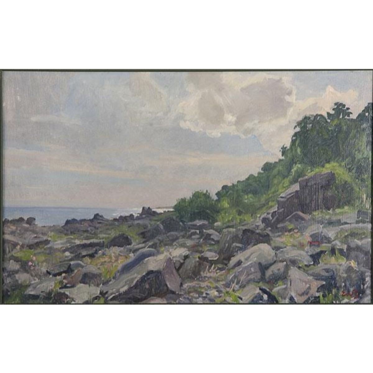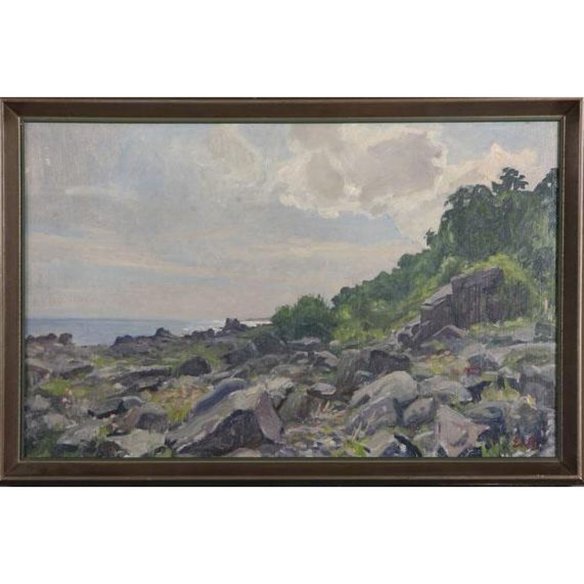 Listed artist, Erik William Johnson. ( Danish 1886-1948 ) "Coastal Landscape", oil on board, signed lower right, 15 1/4" X 24". In original wood frame.