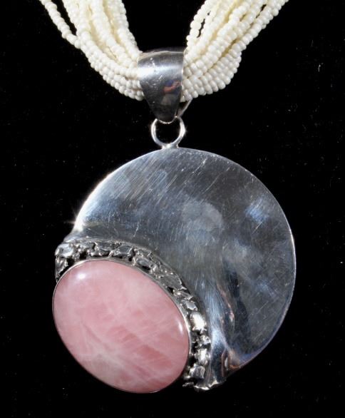 For your consideration is a signed David Zachary rose quartz, sterling silver and white trade bead necklace. This necklace is great shape and features 16 individual strands of white trade beads. The rose quartz is cut into an egg shape and rests within a marked sterling siver centerpiece. The necklace measures 13.25" long.