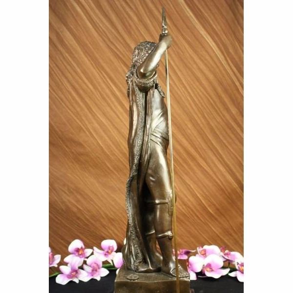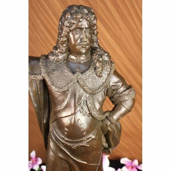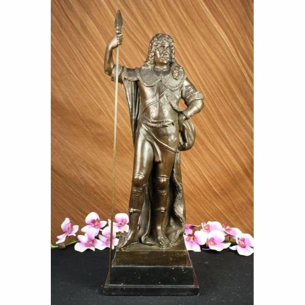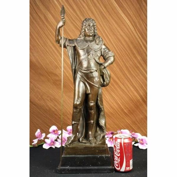 This is the sculpture of King Louis xiv, Standing with his spear at hand. This king has lavish long wavy hair and he is wearing a coat that goes down to the floor, it looks like a beautiful custom made robe.Louis XIV of France ranks as one of the most remarkable monarchs in history. He reigned for 72 years, 54 of them he personally controlled French government. The 17th century is labeled as the age of Louis XIV. Since then his rule has been hailed as the supreme example of a type of government - absolutism. He epitomized the ideal of kingship. During his reign France stabilized and became one of the strongest powers in Europe. Condition: This sculpture is in perfect condition. Bronze Dimensions with Marble Base:Height 23" x Width 8" Marble Dimensions:8" X 7" Height without base: 21" Weight :28 LBS Inventory : 14X0953881