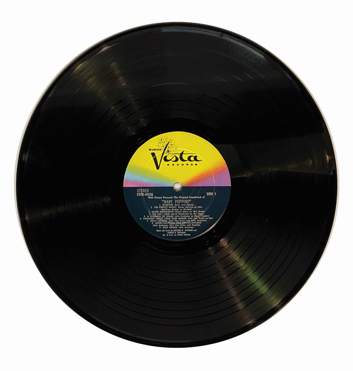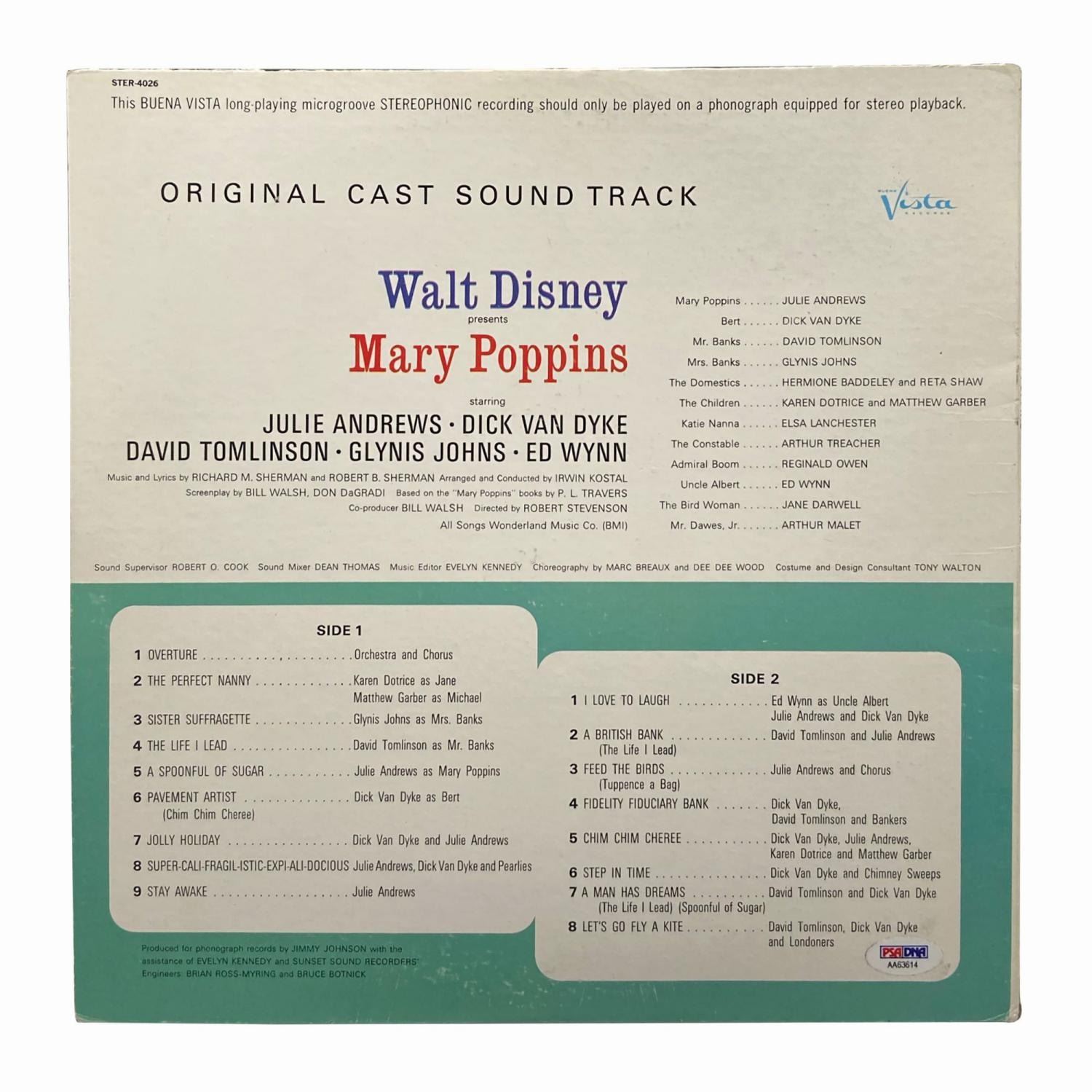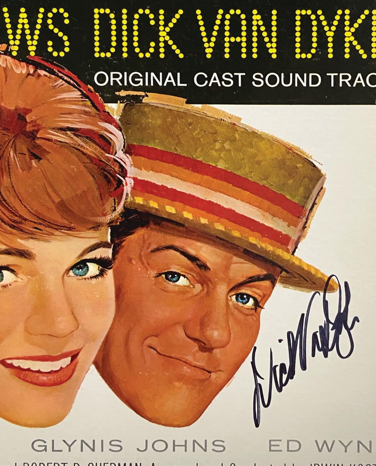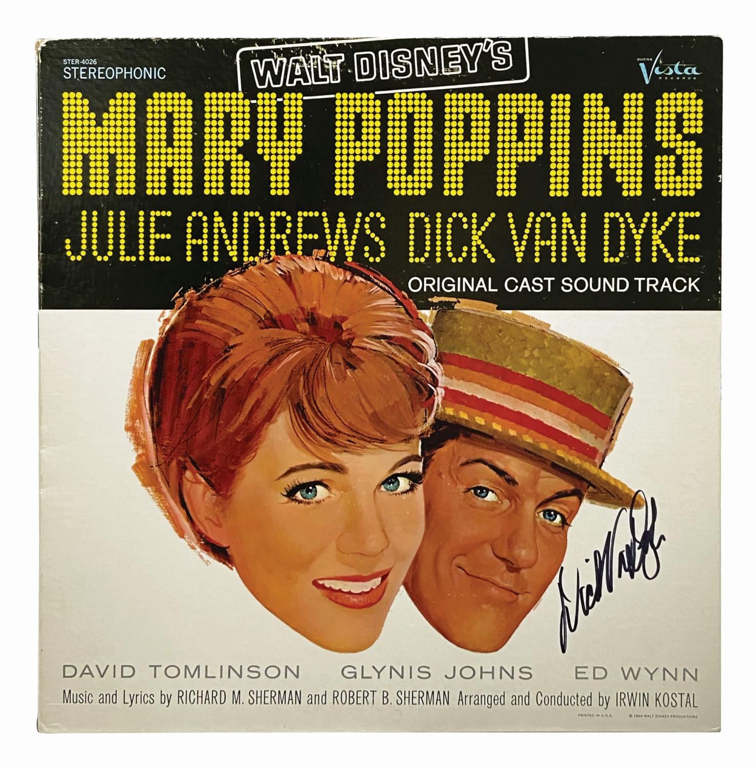 (Disney, 1964) This is an original sound track record for Walt Disney's Mary Poppins that has been signed on the cover by the film's star, Dick Van Dyke. The signature has been PSA authenticated, and includes a unique certification card that matches the small PSA label placed on the reverse of the album cover. The record measures approximately 12.5"x12.5" within its album cover, and is in good used condition. There is minor surface wear to the vinyl and some cover wear, including minor separation along the top edge. The album presents beautifully and is a wonderful signed artifact from this beloved film.