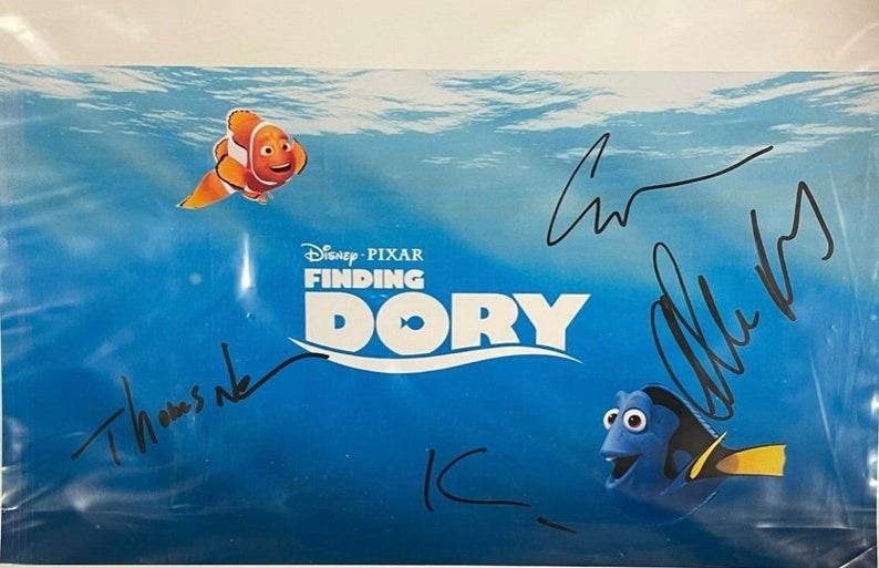 Signed by Ellen DeGeneres (Dory) , Thomas Newman (composer), Kaitlin Olsen (Destiny) , Dominic West (Rudder).