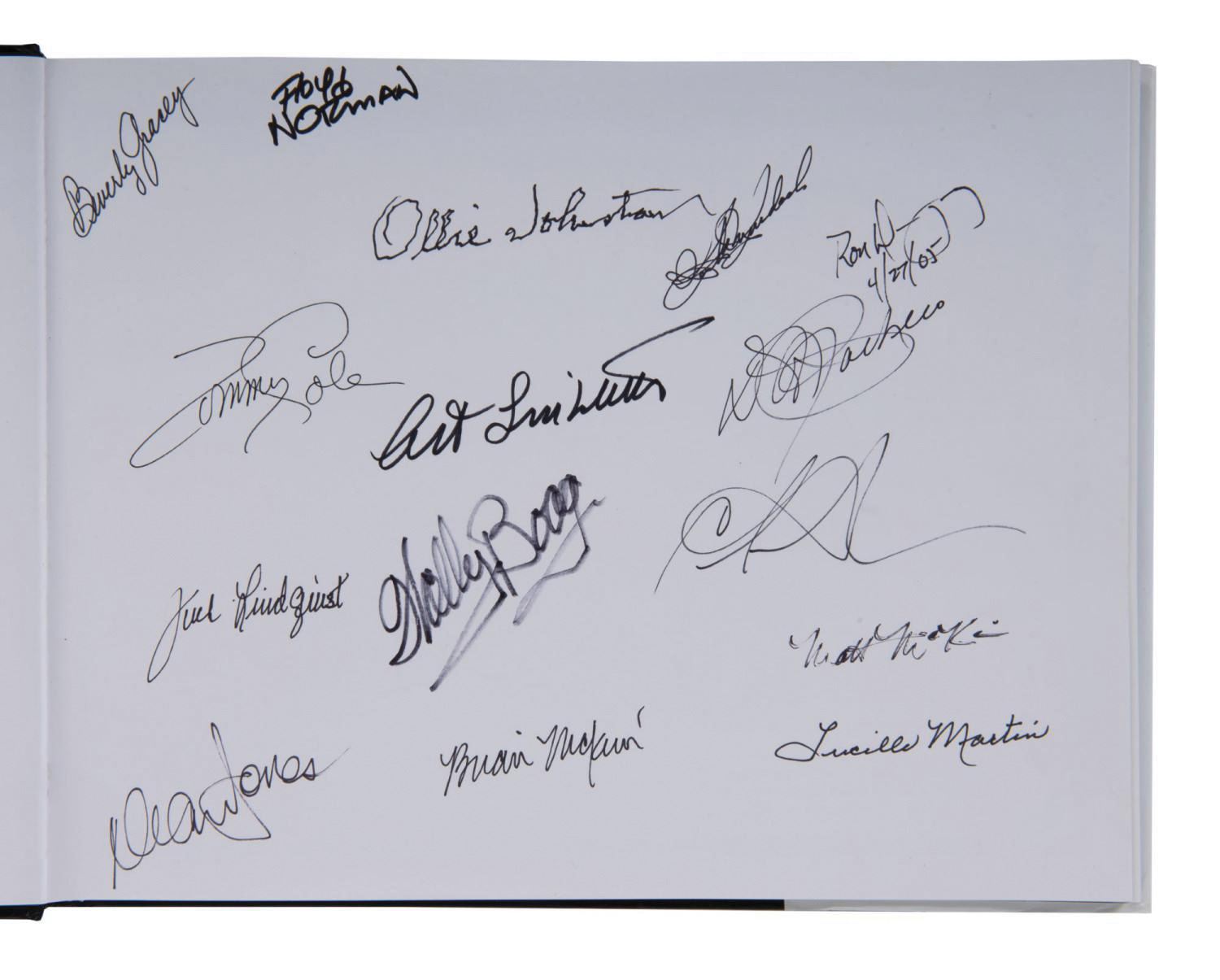 (Disneyland, 2005) A signed copy of "Homecoming Destination Disneyland" by Carlene Thie. The book tells the story of Disneyland through powerful black and white photography of the Park's construction, as documented by photographer Mel Kilpatrick. This First Edition copy is signed by 15 Disneyland Cast Members and Imagineers who made contributions toward the publication's production, including Wally Boag, Jack Lindquist, Ollie Johnston, Tommy Cole, and many more. Measuring 11.5"x8.75", the book and dust jacket are in very good condition, with few scuffs, and very minor wear to corners and edges.