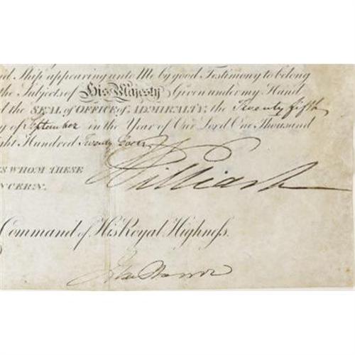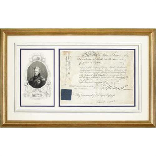 <B>Signed Document from King William IV</B></I><BR><BR>The document on parchment, signed by William IV, King of Great Britain, (r. 1830-1837), dated September 25, 1834, to Anne of London, as a certificate of Registry, with Royal emblems, framed together with a lithograph of the Monarch, 16 x 25 in.<BR><BR><BR><BR><b>Shipping:</b> Requires 3rd Party Shipping (<a target="_blank" href="http://www.heritageauctions.com/common/shipping.php">view shipping information</a>)