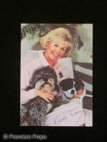 This is a signed, small color photo of actress, singer, and animal rights activist Doris Day. Born Doris Mary Ann Kappelhoff, Doris Day cultivated the original 'girl next door' image and appeared in 39 films, as well as releasing 29 albums. The photo features Ms. Day holding two of her dogs and is signed in blue ink. (measures approx. 3 1/2" x 5")
