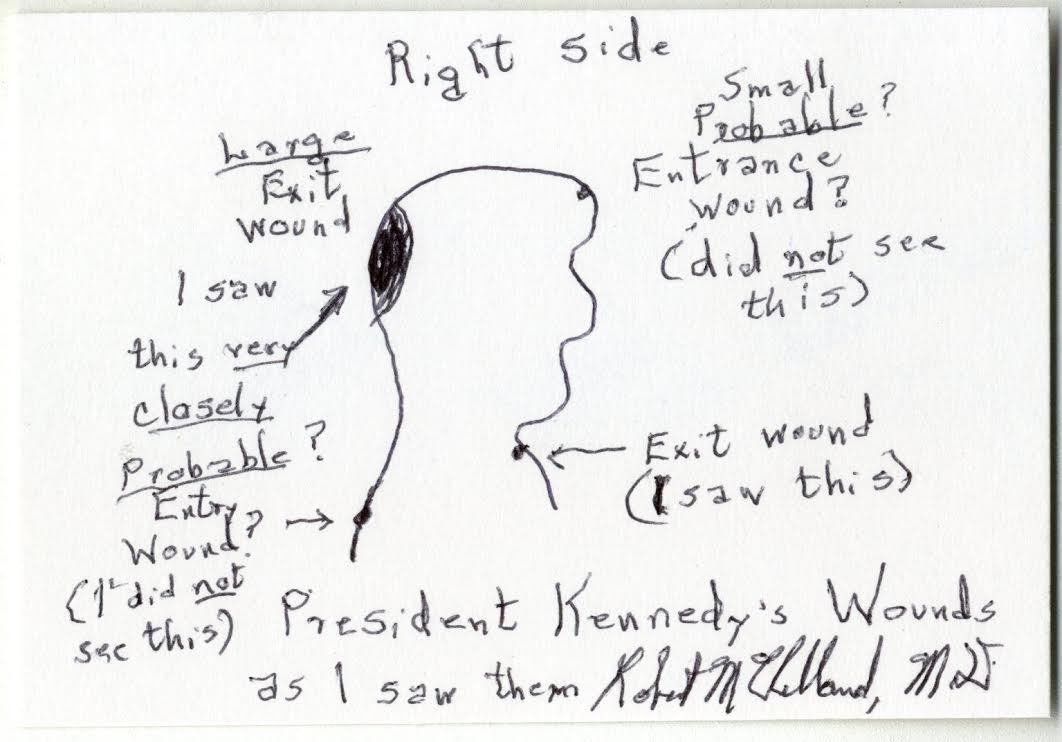 Signed drawing entitled ''President Kennedy's Wounds'', rendered by Dr. Robert McClelland, one of the physicians who attended to John F. Kennedy at Parkland Hospital after the President was shot. McClelland was the doctor responsible for holding the President's head as other surgeons tried to save his life, and was therefore in the unique position to see the extent of his head wounds. McClelland has stated that he ''absolutely'' believes there were two shooters, which his drawing suggests, and doesn't rule out the possibility of a government conspiracy to assassinate the President. With the right side of the head in profile, McClelland draws a ''Large Exit Wound'' at the back of the head, with a corresponding ''Small Probable? Entrance Wound? (did not see this)'' near the forehead. He also draws a bullet wound on the neck, stating that it's the ''Entrance wound (I saw this)'', with the corresponding bullet wound in Kennedy's back. McClelland writes at the bottom, ''President Kennedy's Wounds as I saw them'', signed ''Robert N. McClelland, M.D.'' White card composed in black ballpoint pen measures 5'' x 3.5''. Near fine condition.