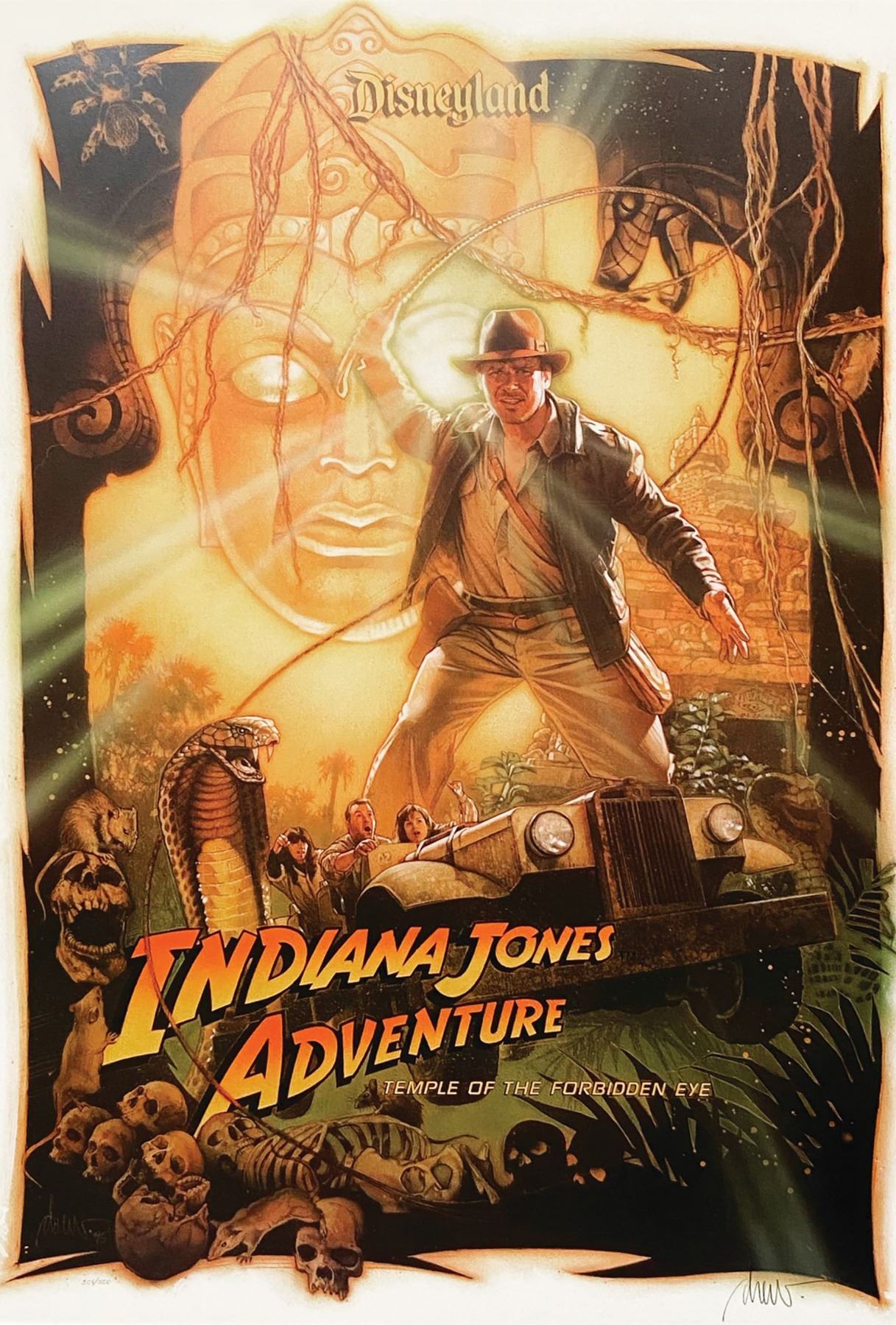 (Disneyland, 1995) A beautiful limited edition lithographic print of the Indiana Jones Adventure attraction poster. When the attraction opened at Disneyland in 1995, guests were able to purchase a limited edition lithograph of the attraction poster which was signed and hand-numbered by the artist Drew Struzan himself. This particular lithograph is numbered 308/500 in the lower-left and is signed by Struzan in the lower-right. The lithograph measures approximately 37"x24" within a 46.5"x34.5" frame. The poster is in very good condition with minor surface wear.