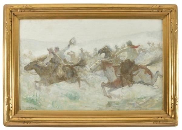 Edmund F. Ward (1892-1991) "The Race". 16"x 25". Oil on artist board. Signed and dated 1919 lower left. Ward painted with Norman Rockwell for the Saturday Evening Post. Important American Illustrator.