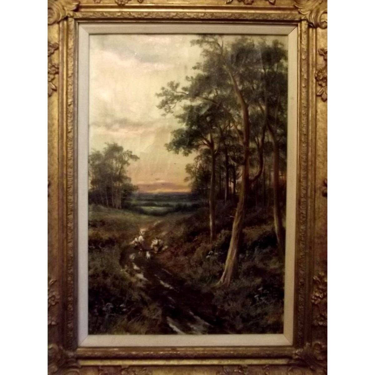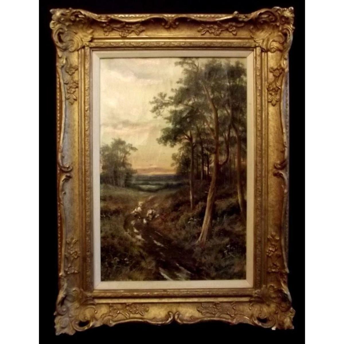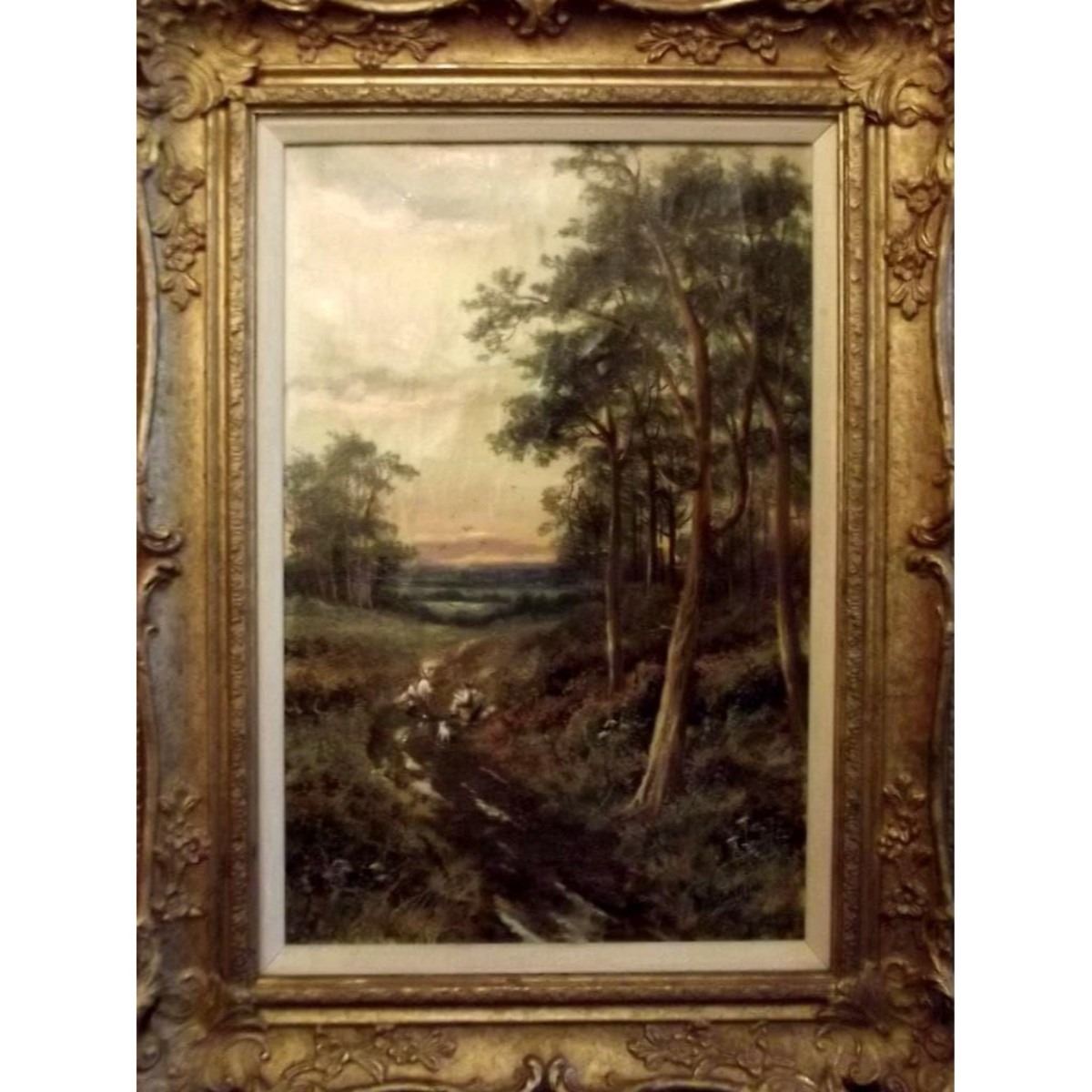DANIEL SHERRIN ( British, 1868-1942 ) oil on canvas landscape of fishermen in woodland stream at sunset with faithful dog. Landscape year 1900 - 1920. Signed bottom right "SHERRIN". 12" X 18" canvas in period ornate gold gilt 18" X 24" frame. Daniel was born in Brentwood, Essex, England in 1868, the son of John Sherrin, R.I. (1819-1896) who specialized in Still Life subjects. 9650-030118-EB-90431