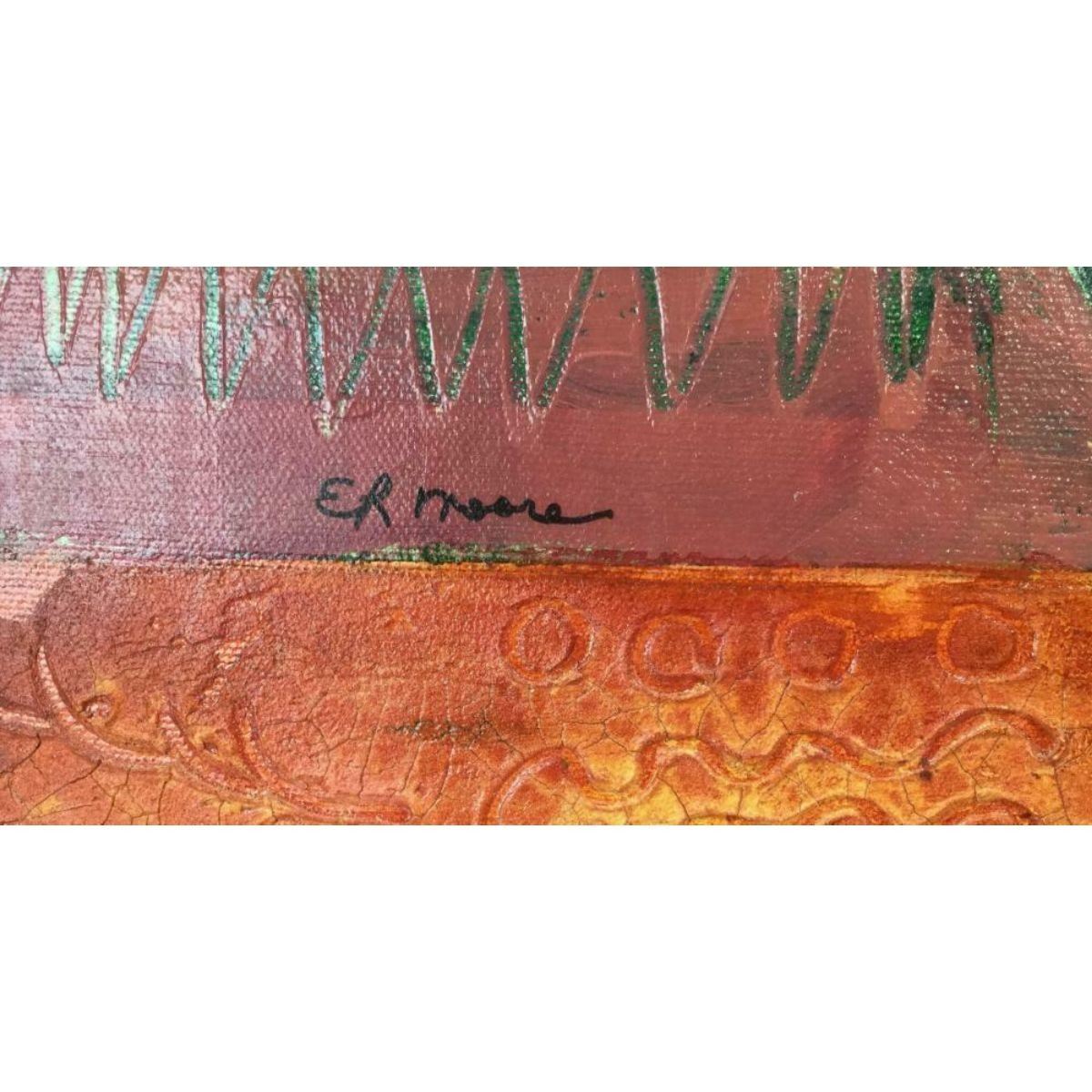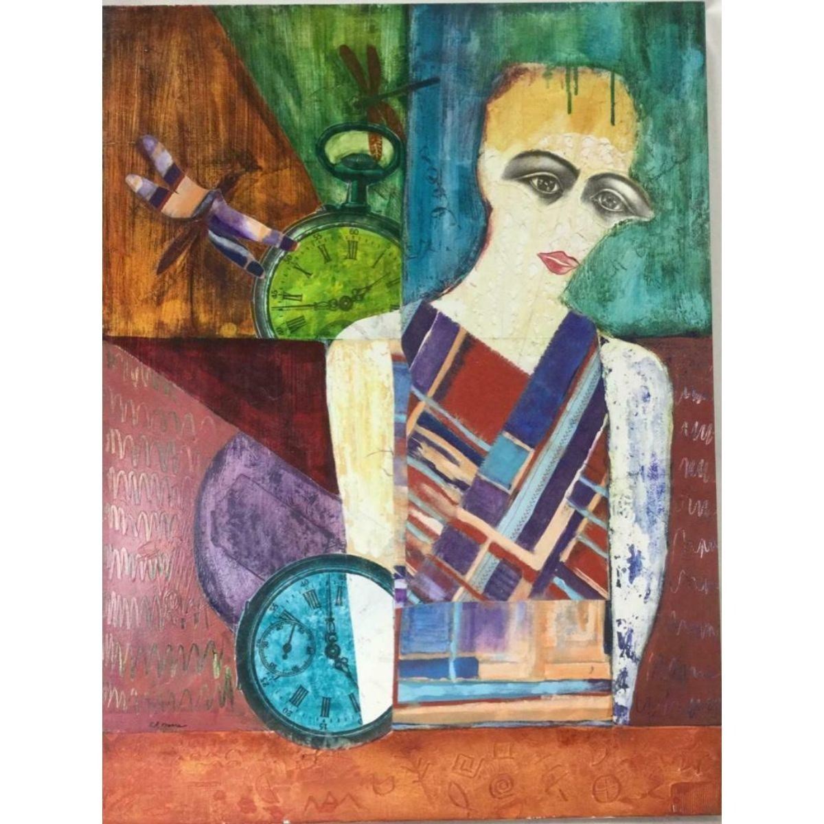 Elizabeth R. Moore ( California, b.1943 ) " Time Flies" mixed media on canvas abstract art, possibly self-portrait, depicting a woman with clocks & dragonflies. 30" X 40" with hanger on reverse. Signed in lower left corner. Elizabeth Moore is a mixed media artist who enjoys experimenting with a variety of tools, techniques, media, and materials. She is both a conceptual & cultural artist. In each of her paintings, she attempts to make meaning & tell a story, through the use of cultural symbols, signs, words, & images. Her work is typically multi-layered with collaged elements, heavily textured, brightly colored, & non-representational. Most of her paintings include hidden signs, symbols, & words that reflect an inner dialogue about the piece that is rarely evident at first glance. These hidden elements represent cultural artifacts, artistically expressed. Â