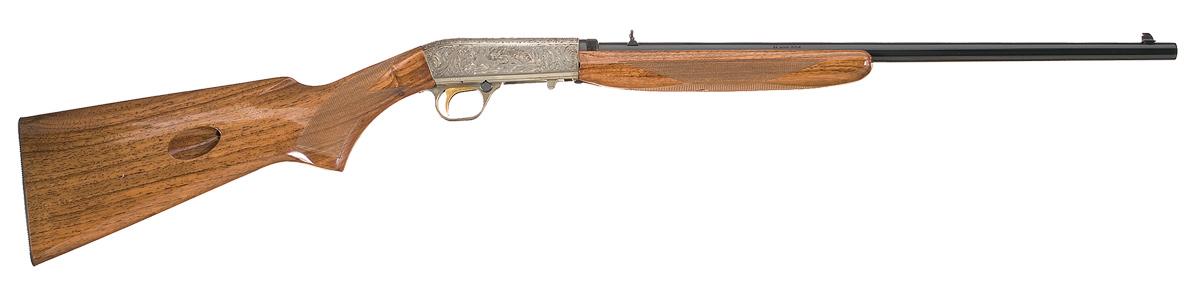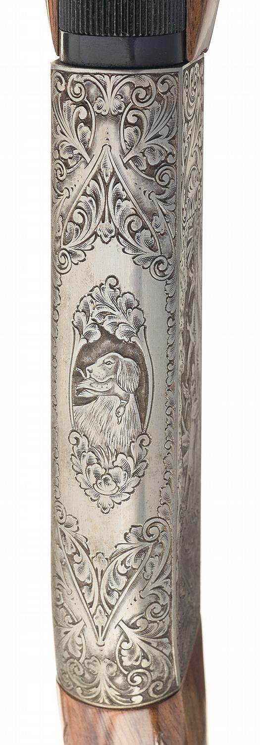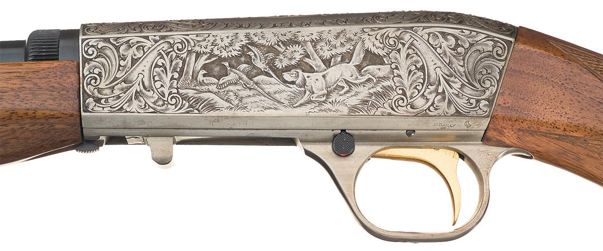 Manufactured in Belgium between 1956 to 1974 and features floral scroll engraved receiver signed by J.P. Bailly, with a hunting dog chasing game birds on each side and a dog with a duck in its mouth on the top. Standard barrel markings, fixed front sight, an adjustable folding rear leaf sight, gold washed trigger and mounted with an attractive Field Grade checkered walnut forearm and pistol grip stock with a steel serrated buttplate.
