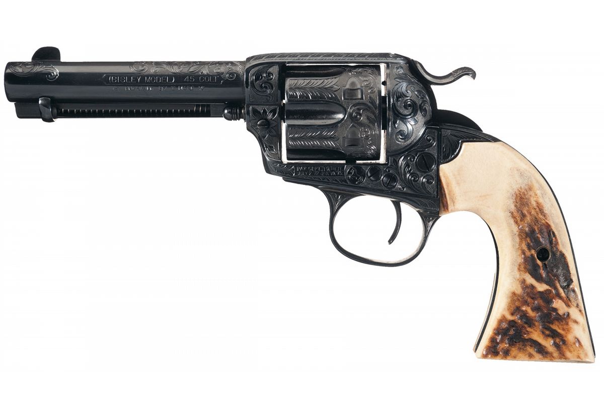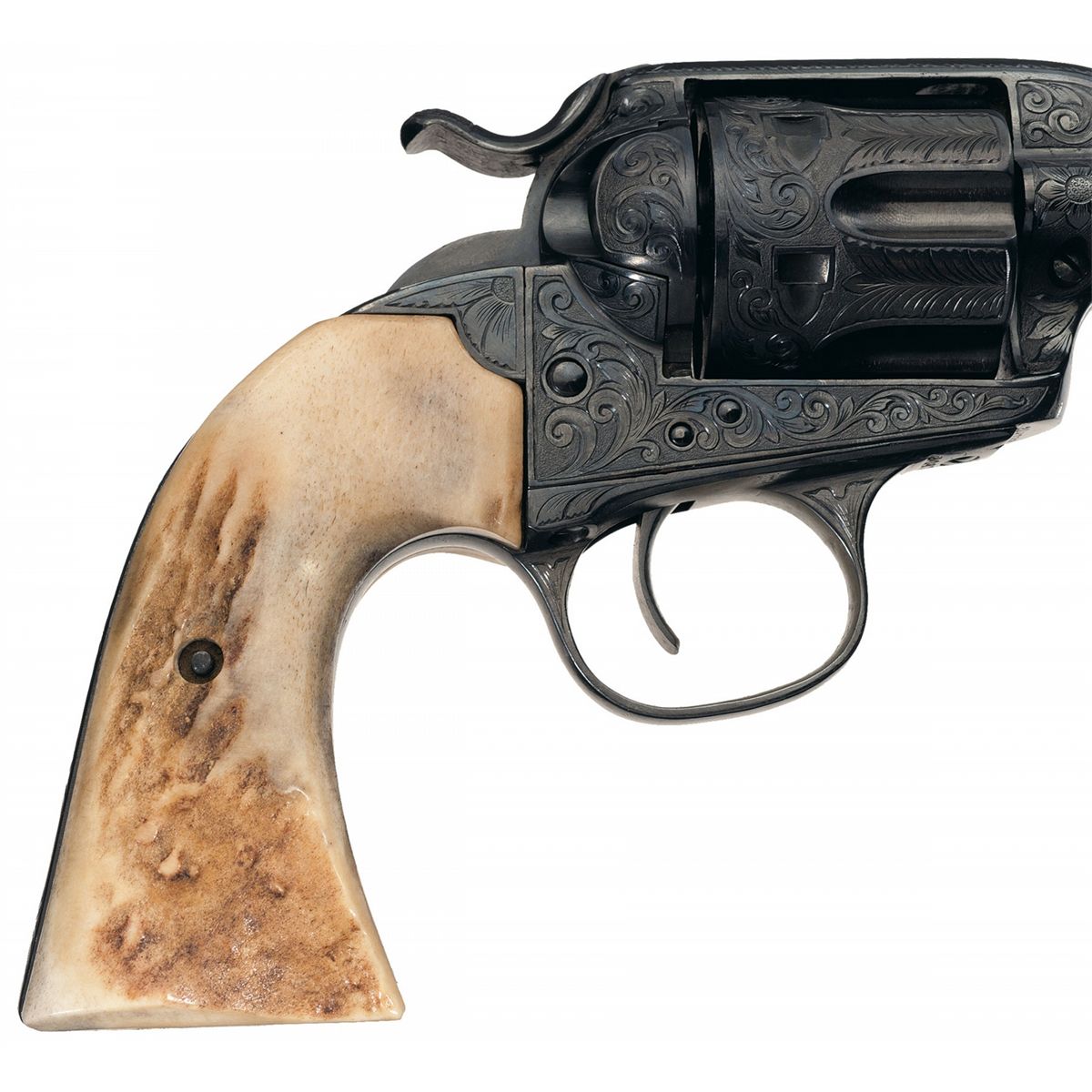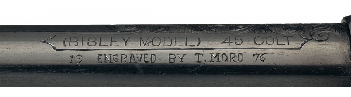 Manufactured in 1901 and subsequently custom engraved with floral scroll patterns with a matte background on the barrel, frame, ejector housing and cylinder flats, with a feather design on the top strap and a simple oval pattern on the back strap. The top of the barrel is marked with the two line address, the left side "(BISLEY MODEL) 45 COLT" and the left side of the frame is marked with the two line, three patent dates followed by the circled Rampant Colt. The left side of the barrel is also marked "19 ENGRAVED BY T. MORO 76". All blue finish and fitted stag grips.