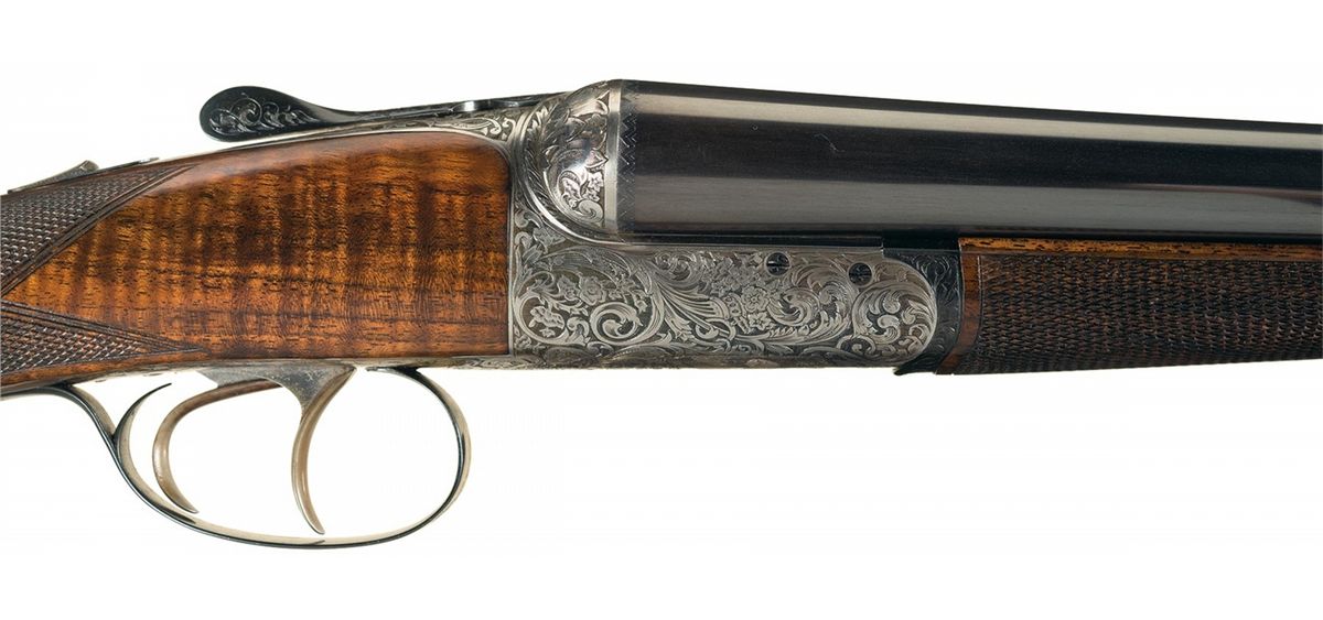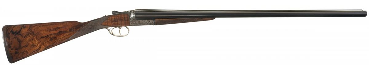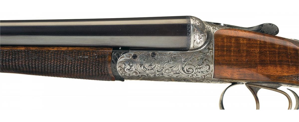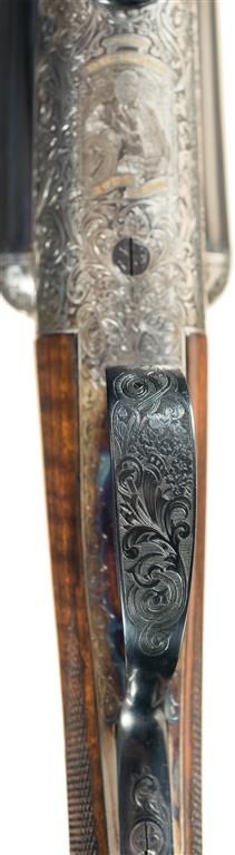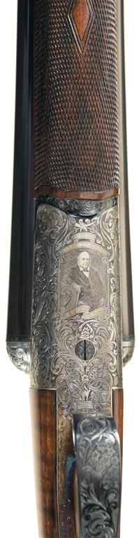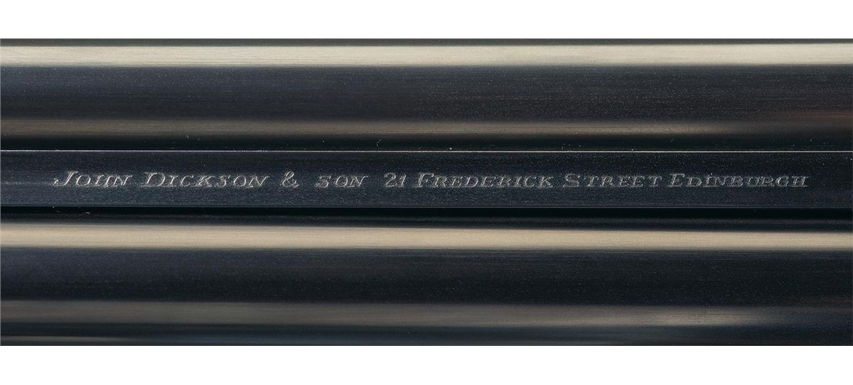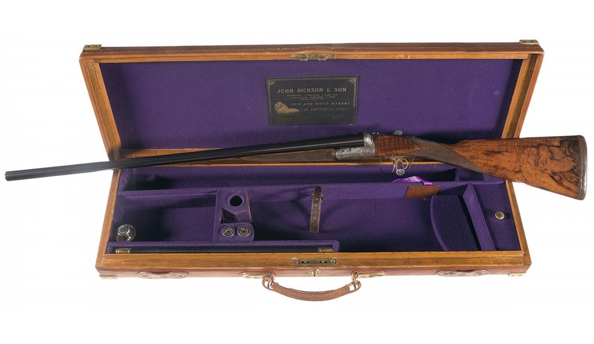 Manufactured circa 1908. John Dickson & Son was established in 1820 and to this day are Scotlands leading maker and supplier of fine sporting guns. The Dickson "Round Action" and MacNaughton "Bar In Wood" shotguns are famous around the world. Single brass bead sight on the solid concave rib marked "JOHN DICKSON & SON 21 FREDERICK STREET EDINBURGH". The breech end of the rib is engraved with a floral design with a matte background and the breech end of the barrels has a geometric design. The round body action is engraved with floral designs with a portrait of John Dickson sitting in a chair on the underside with gold inlaid "JOHN/DICKSON" in banners above and "1794/1880" in a banner below. Directly in front of the trigger guard is signed "PETER/CUSACK" in panels. The floral engraving extends to the break lever, trigger guard and forearm hardware. The water table is marked with two "crown/GP" proofs and the barrel flats are marked with various British proof marks as well as "12" in a diamond, "18-5" and "850 BAR". The matching serial number appears on the lower tang, water table, bottom of the right barrel and in inside of the forearm hardware. 3 inch chambers, choked improved cylinder/modified with ejectors. Double triggers, tang mounted safety with gold "SAFE" and mounted with a nicely figured deluxe multi-point checkered walnut forearm and straight grip stock with a leather recoil pad and gold initial oval. The bores are .728, cast off 1/8 inch, toe out 1/2 inch drop at the heel,1 7/8 inches, drop at the comb 1 3/8 inches and the length of pull is 15 3/8 inches. The shotgun is complete with a oak and leather takedown case with brass corner protectors, leather straps, leather handle, canvas cover and blue felt lining with a leather John Dickson label affixed to the inside of the lid. In the case are a two piece brass and ebony Purdey cleaning rod, John Dickson nickel oiler and four nickel snap caps.