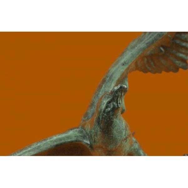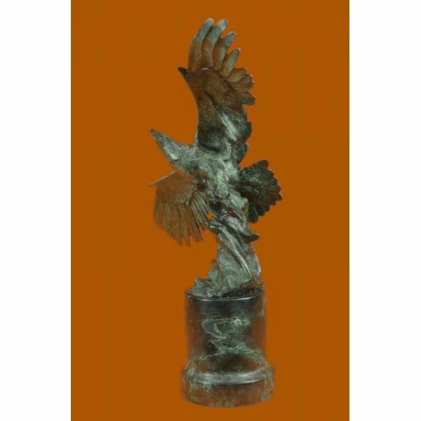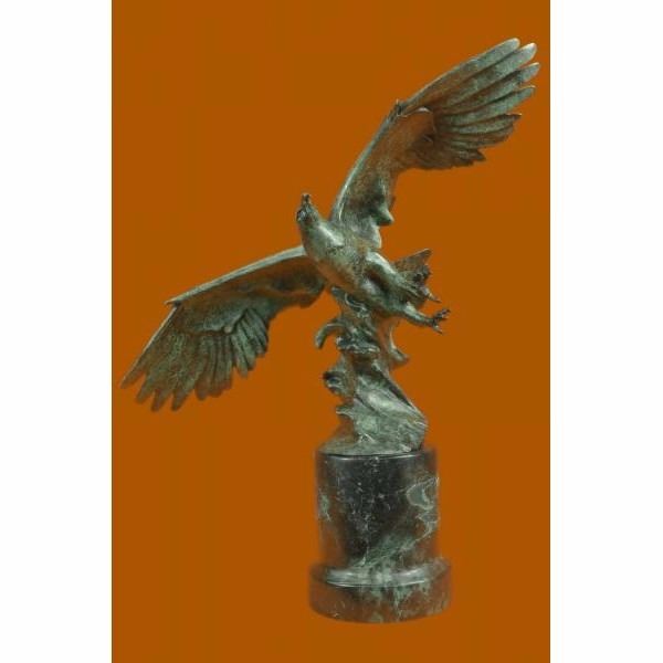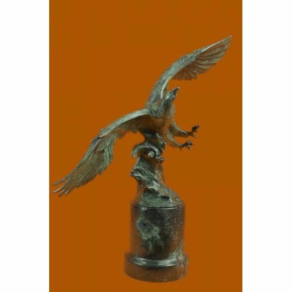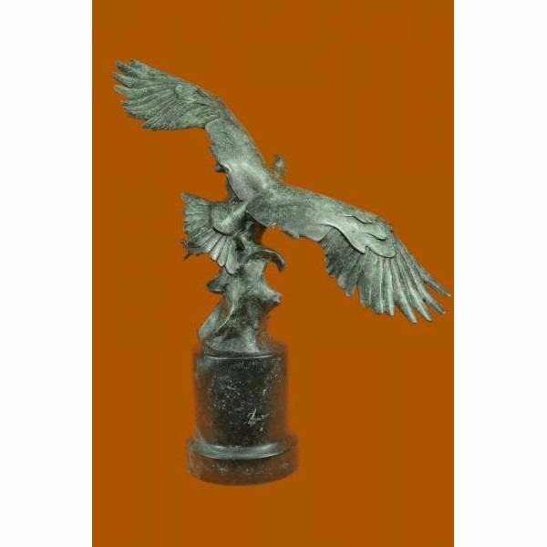 A fascinating and eye catching sculpture. A large eagle spreads his wings and prepares for flight. His large wings arch high above him. His talons prepare to release the wood it clutches. His intense glare sets in the distance on some welcoming prey. 100% bronze and handmade,this two-toned brown and silver patina sculpture was cast using the "Lost Wax Method" and mounted on a marble base. It features the signature Milo. Condition : This sculpture is in perfect condition. Bronze Dimensions with Marble Base:Height 20.5" x Width 21" Marble Dimensions: Diameter 6" Height without base: 15.5" Weight :23 LBS Inventory : 28AL45815382