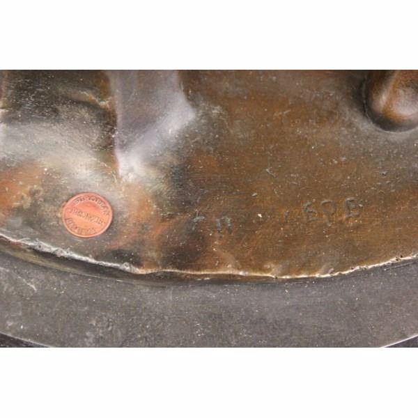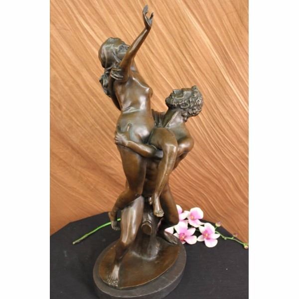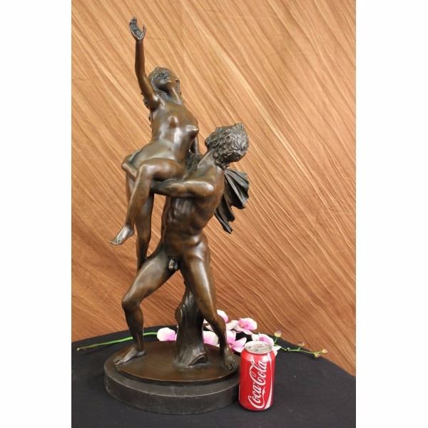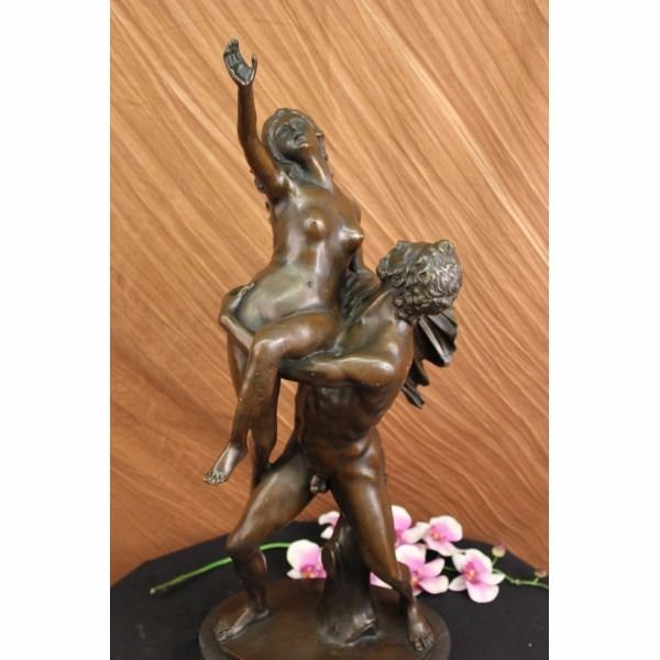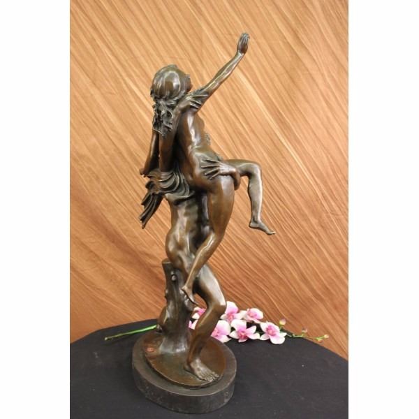 Two skilled dance partners demonstrate their skills while nude. There a strong romantic connection between the two dancers, which only makes their movement more artistically appealing. Their physiques are impeccable, his body is muscular and hers lean. He bends slightly highlighting his powerful thighs and his arms support her entire body in the air. The sculpture stands on a black marble base. It is signed . It was crafted using the popular lost wax method. Condition: This sculpture is in perfect condition. Bronze Dimensions with Marble Base:Height 28" x Width 19" Marble Dimensions: Diameter 12" Height without base: 27" Weight : 38 LBS Inventory : 64Y55120046
