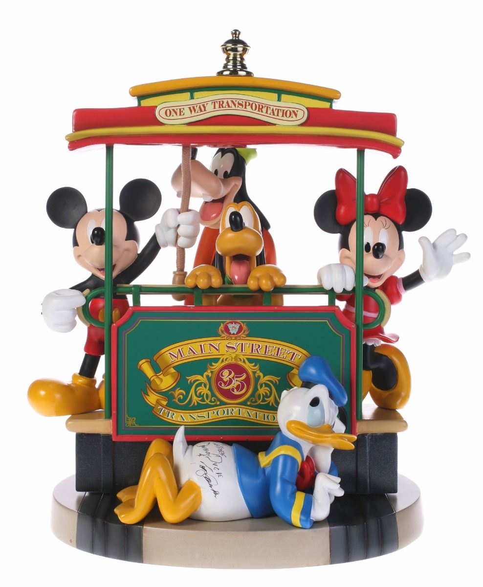(Walt Disney World, 2006) Main Street Trolley "Big Fig" commemorating the 35th Anniversary of the Main Street Trolley at Walt Disney World. The set has five removable figures. Not a part of the regular edition, these figures have all been signed by their respective voice artists. Measures 18"x7" and 11" tall. In good condition with some damage to the top of the trolley.