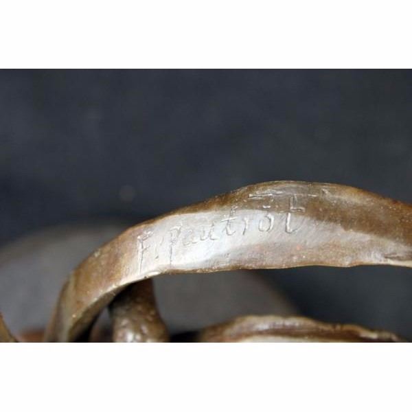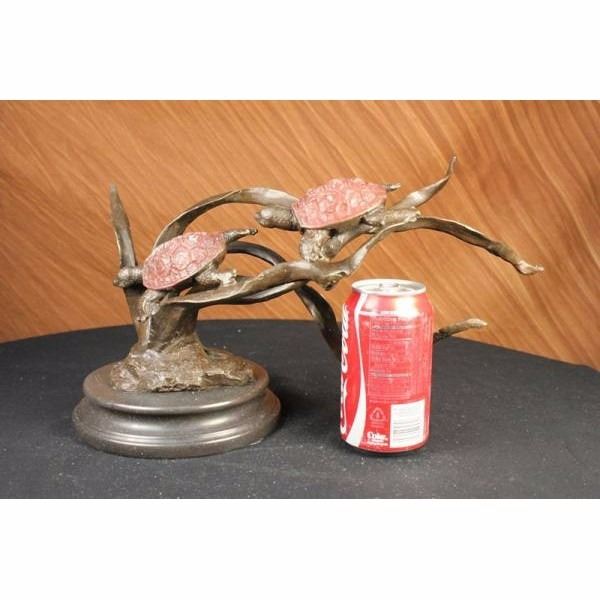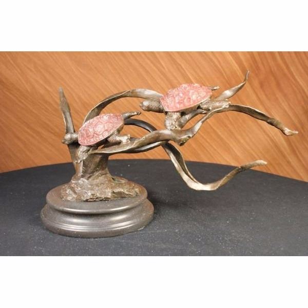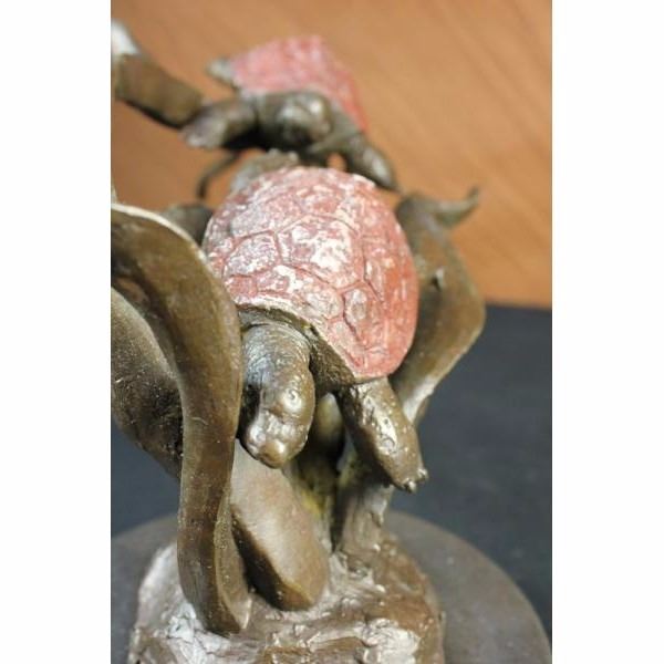 These cute little turtles mates are taking a swim together through the heavily sea water. They play with each other, as they pass a branch of seaweed they lay enjoying their journey. The male leads while the female follows. The beautiful turtle shell is the color of a real tasteful apple, not that you would want to eat a little turtle but the color on these two sea creature are beautiful. This sculpture was cast using the Lost Wax Method and is mounted on a gorgeous heavy marble base with a delightful bronze trim around the base. This sculpture is signed F. Pautrot Condition : This sculpture is in perfect condition. Bronze Dimensions :Height 9" x Width 15" Weight : 12 LBS Inventory:29X23955592