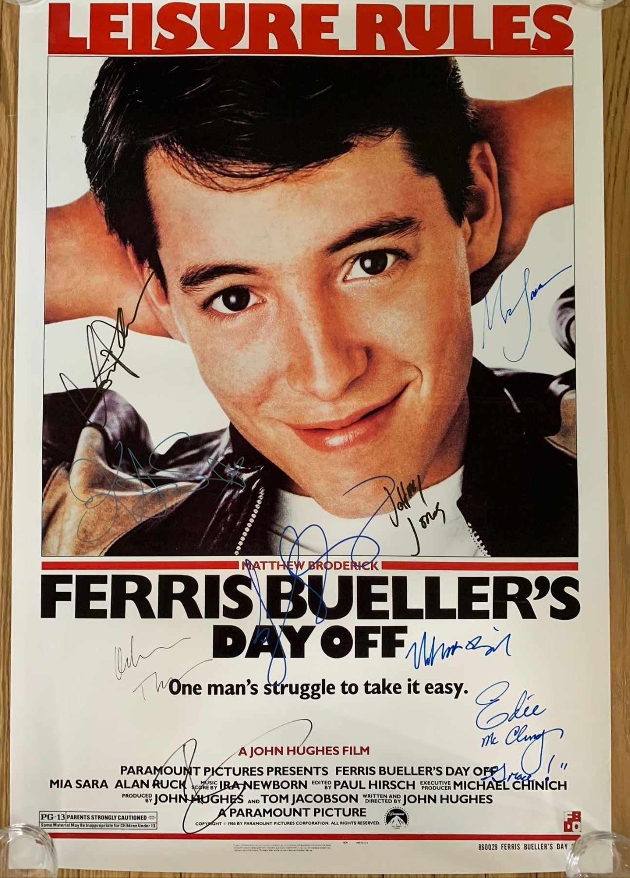 Signed by Matthew Broderick, Mia Sara, Alan Ruck, the late Jeffrey Jones, Jennifer Grey, Edie McClurg, Ben Stein, Kristy Swanson and Charlie Sheen!