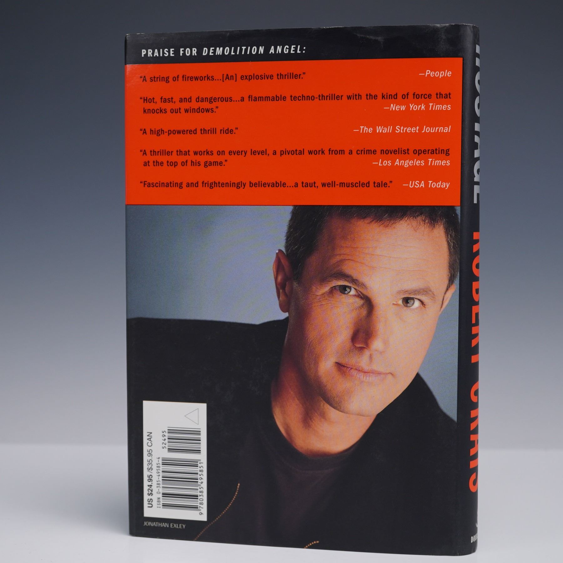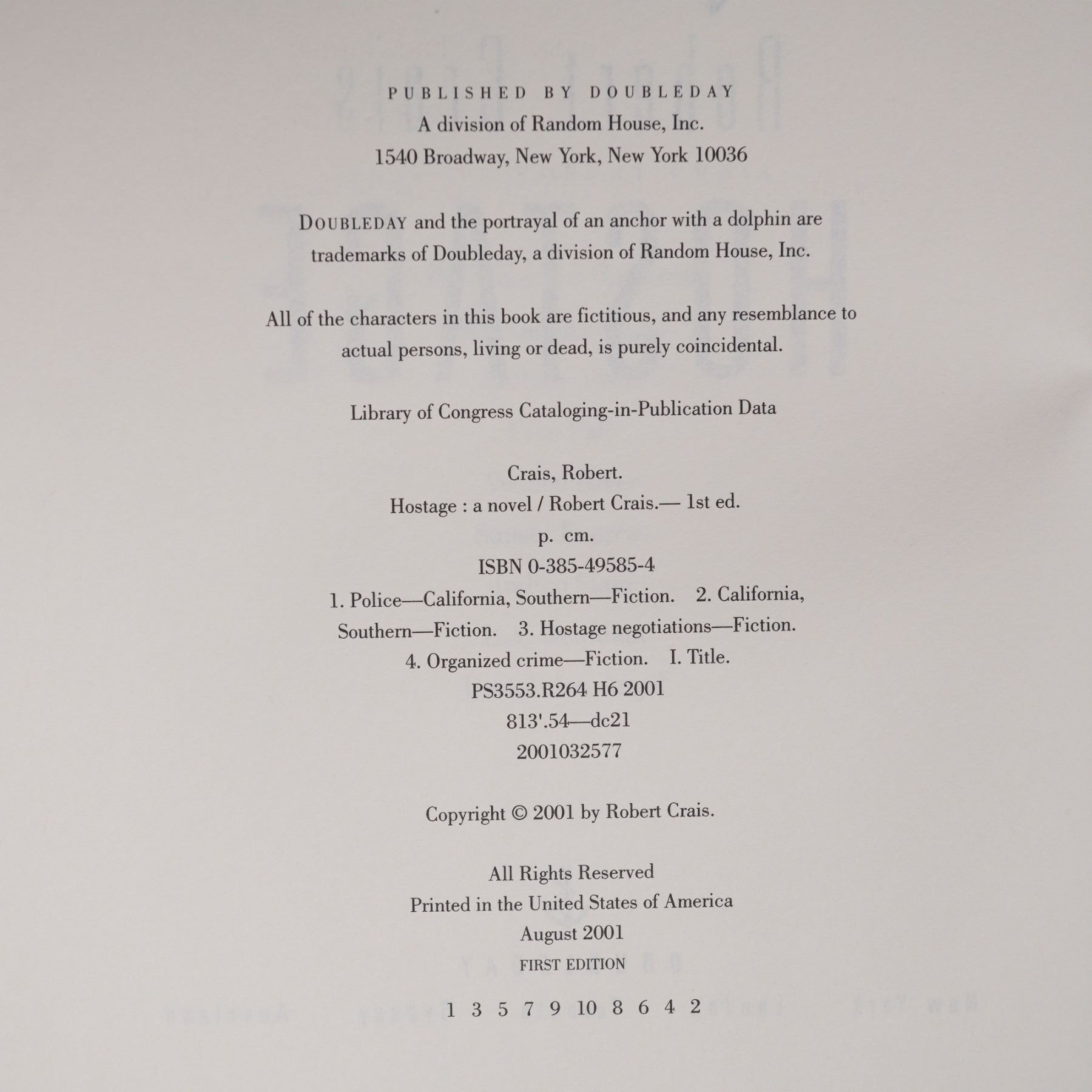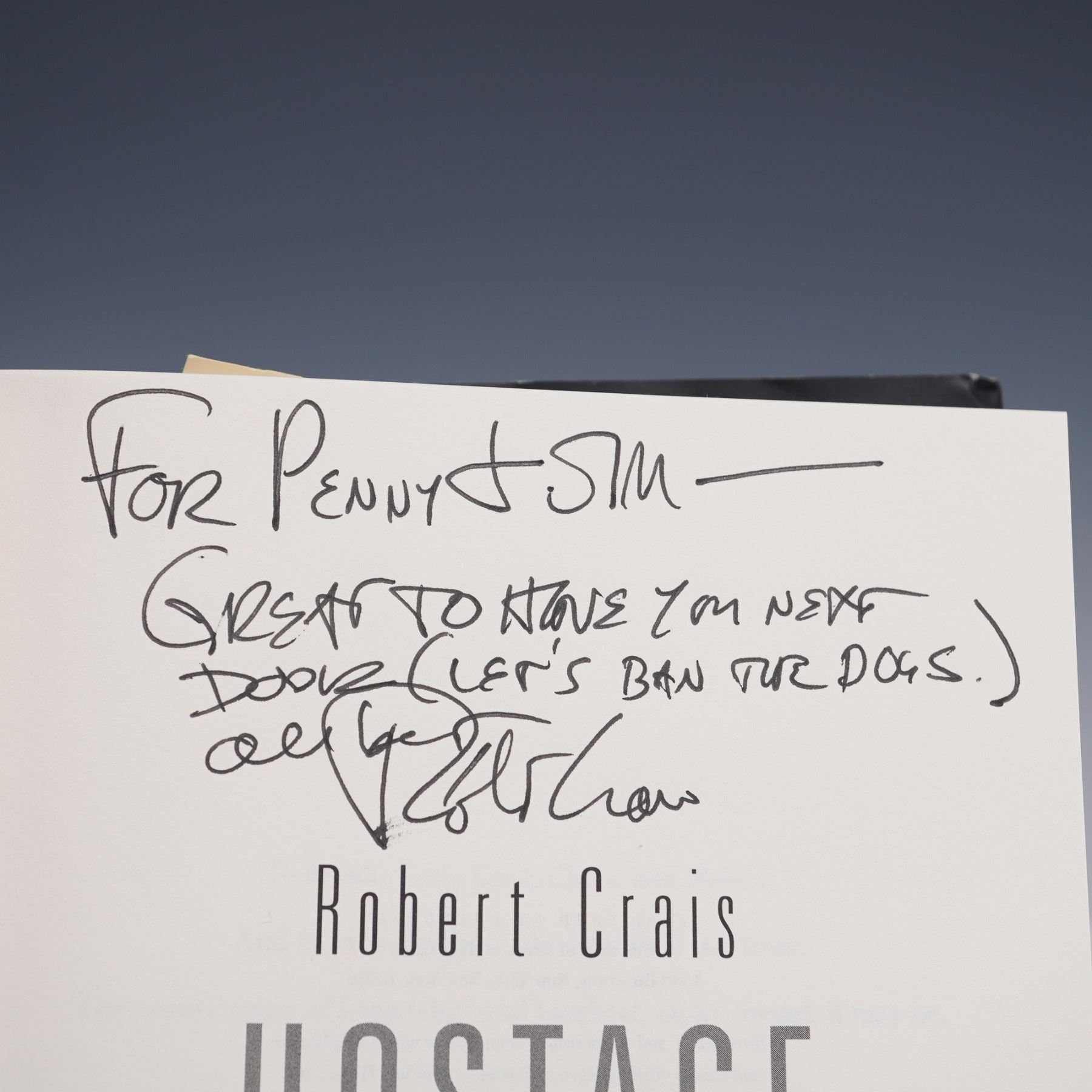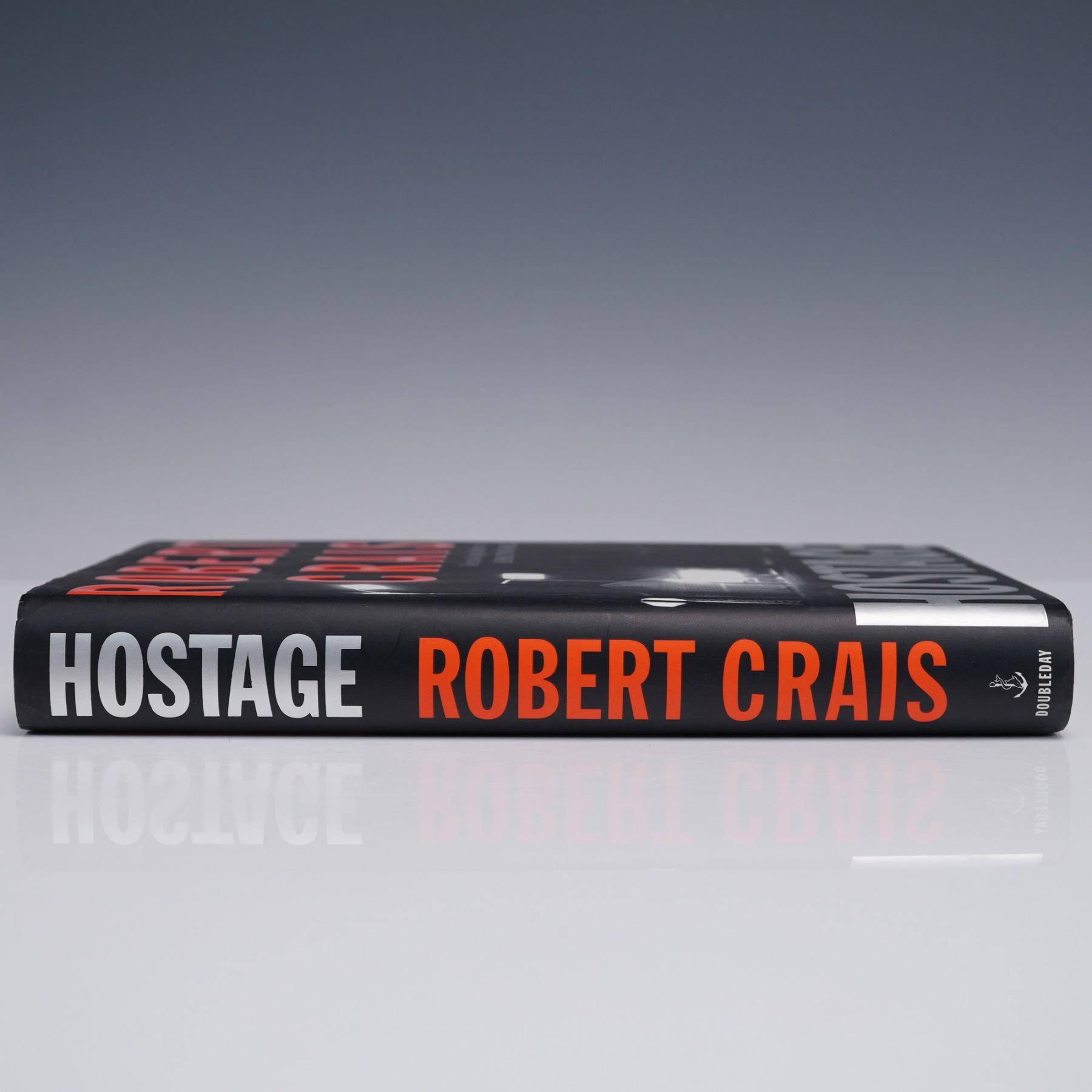Hardcover 373 page book of Hostage by Robert Crais, published by Doubleday in 2001. This is a first edition copy, signed and inscribed by the author on the title page with a personal message. The book has a dramatic dust jacket design with bold red and white lettering over a nighttime photograph of a house under a streetlamp. The spine carries the same bold style, making it stand out on a shelf. Robert Crais signature.