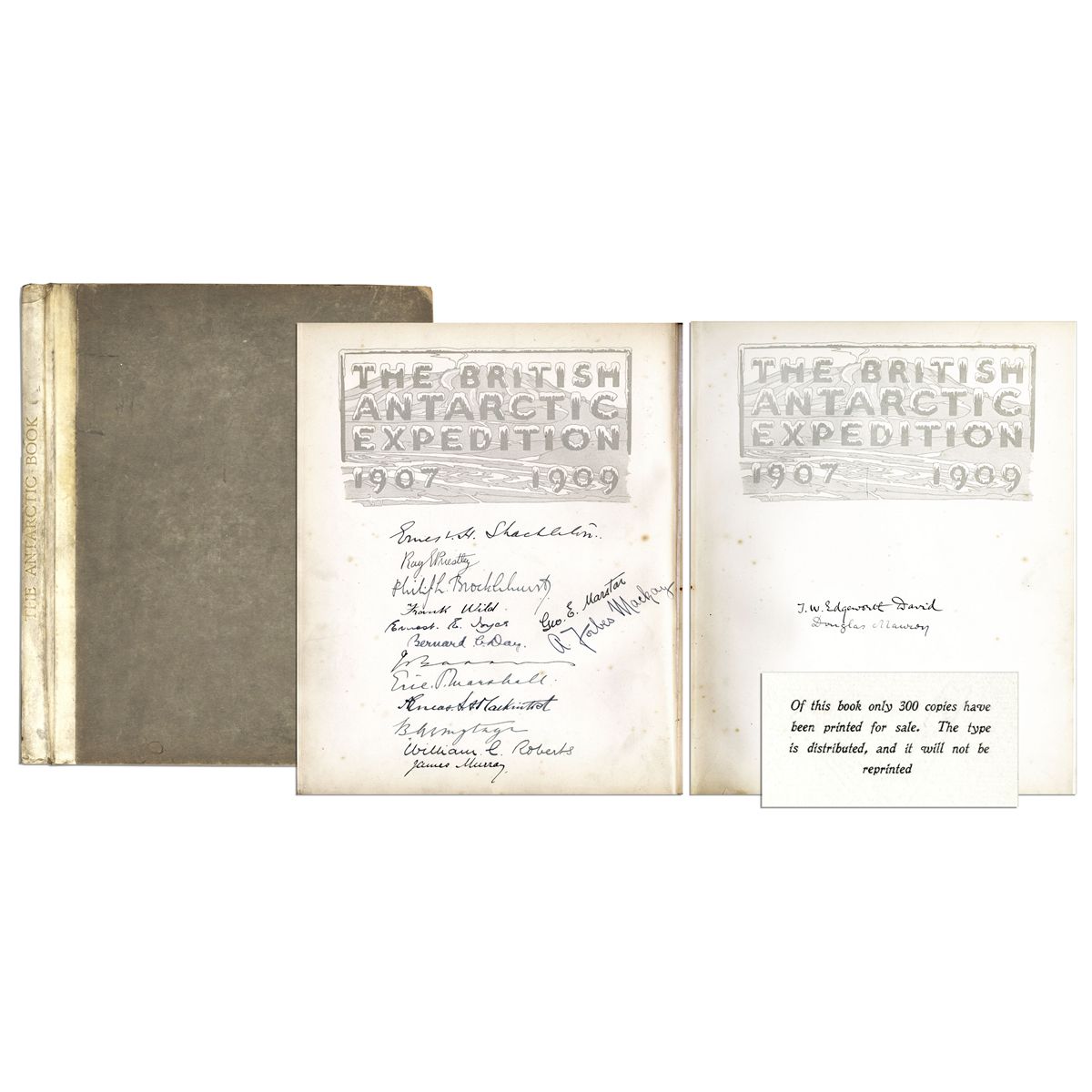 First edition of ''The Antarctic Book. Winter Quarters 1907-1909'' signed by all 16 members of the shore party of Ernest Shackleton's Nimrod expedition. London: William Heineman: 1909. This is the third volume of ''The Heart of the Antarctic,'' Shackleton's account of the expedition to the South Pole published upon his return to England in 1909. It is one of only 300 copies published. 16 signatures appear on the flyleaves under the heading, ''The British Antarctic Expedition / 1907 1909'' beginning with Ernest Shackleton. Book contains color portraits, including one of Shackleton, etched plates by George Marston and one small linocut. Minor soiling and residue from removed bookplate. Stamp for ''Park Home, Glasgow'' appears inside lower cover and on one page of text. Original vellum-backed boards measure 9'' x 11''. Very good condition. A scarce and highly collectible item from the early days of polar exploration.