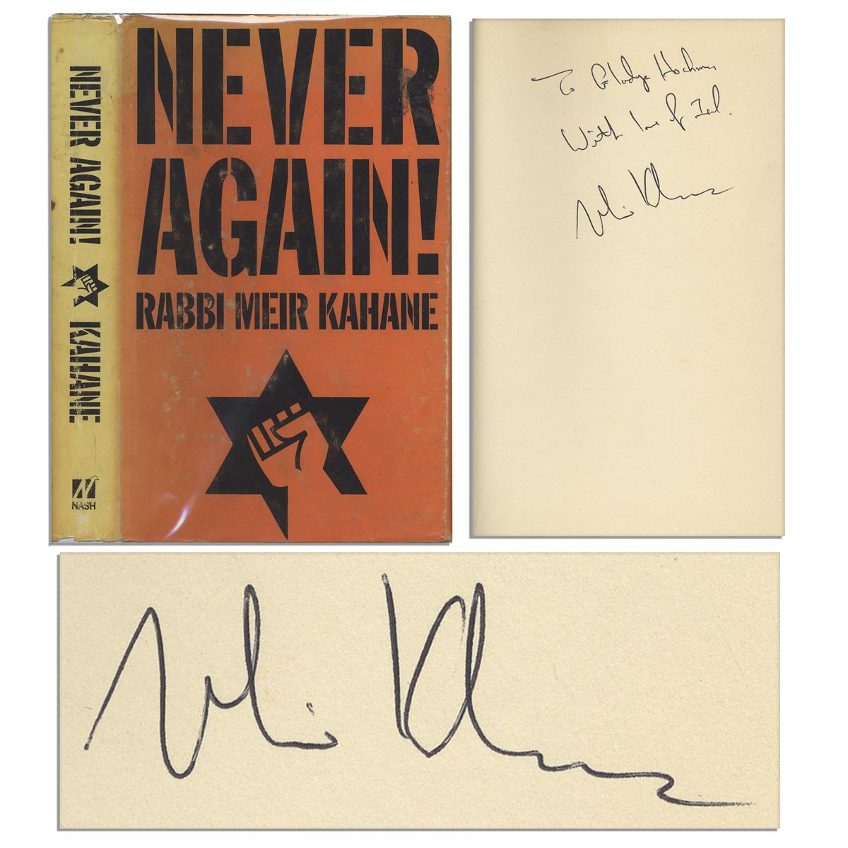 Rabbi Meir Kahane signs a first edition, first printing copy of his book ''Never Again! A program for Survival''. Nash Publishing: Los Angeles: 1971. Kahane writes on the fly-leaf in black ink: ''To Gladys Hochman / With love of God. / Rabbi Kahane''. Here, Kahane extols the principles of the Jewish Defense League in this near fine volume, bound in black cloth boards with gilt lettering in its original dustjacket. Measures 5.75'' x 8.75''. Some sunning to spine of dustjacket and light wear, else fine.