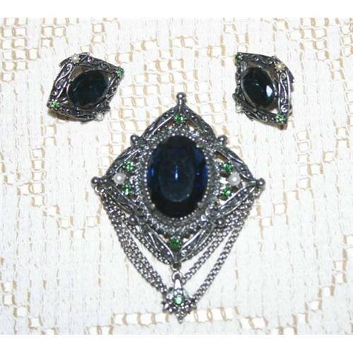 Absolutely gorgeous! Original 1940s Florenza Brooch or Pin and Earrings set; huge faceted oval shaped Sapphire Blue Rhinestone centered in a silver metal with antique finish, highlighted with Emerald green Chaton Rhinestones and tiny white seed beads.
