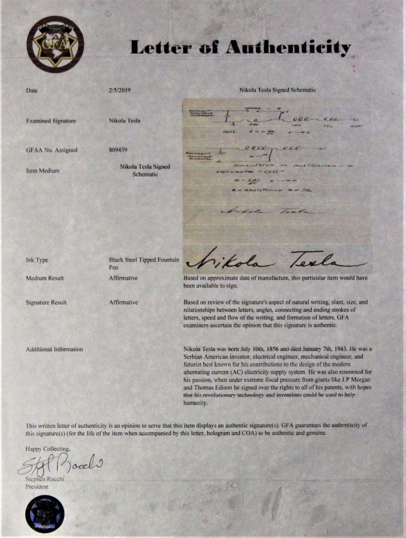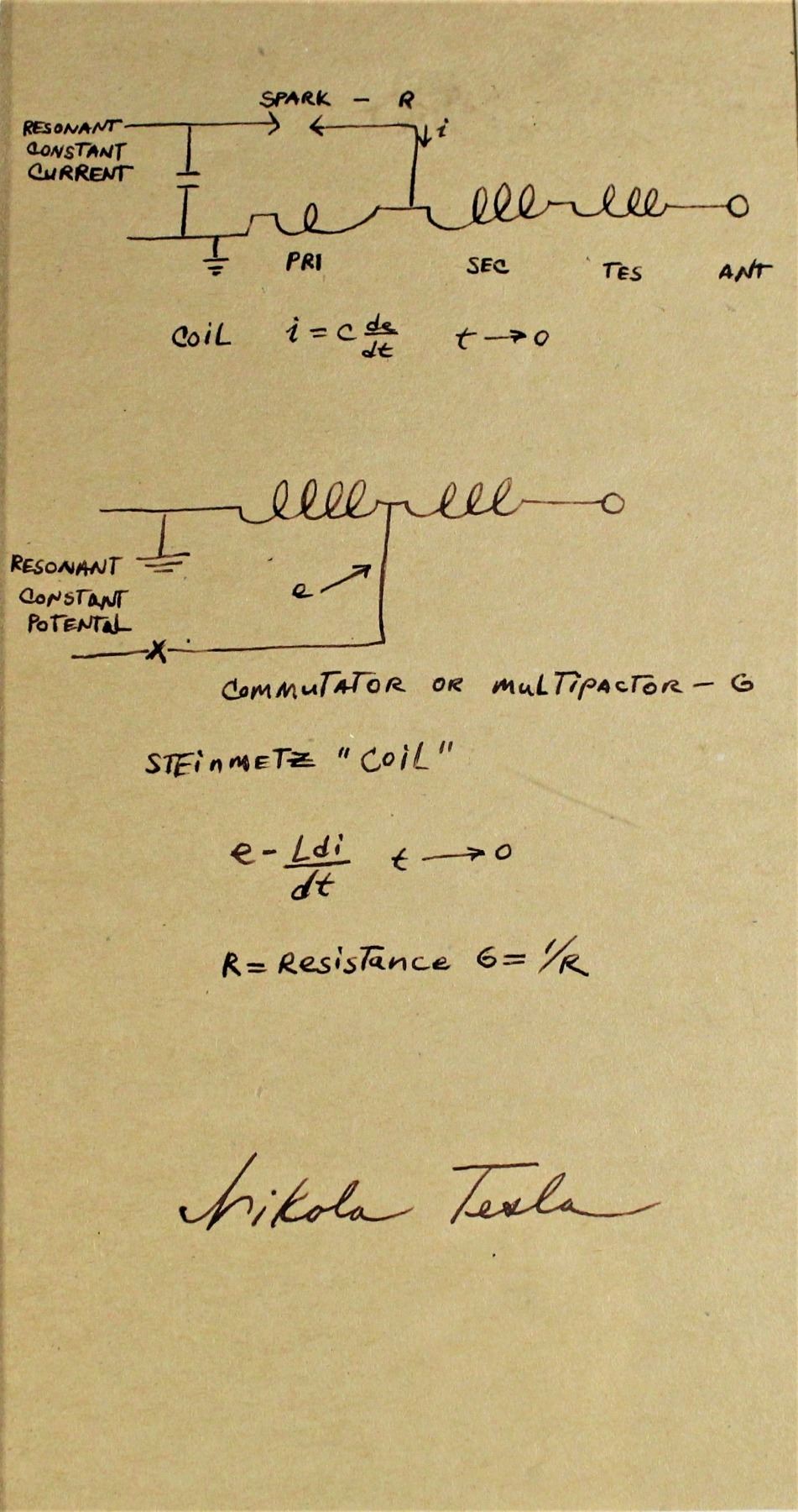 Nikola Tesla (1856-1943) boldy signed 5 ½’ x 10 ¼” Commutator or Multipactor diagram . Matted and framed with three black and white images, 3 ½” x 5 ½”, 6 ½” x 8” and 8” x 10”, with an overall size of 21” x 25”.