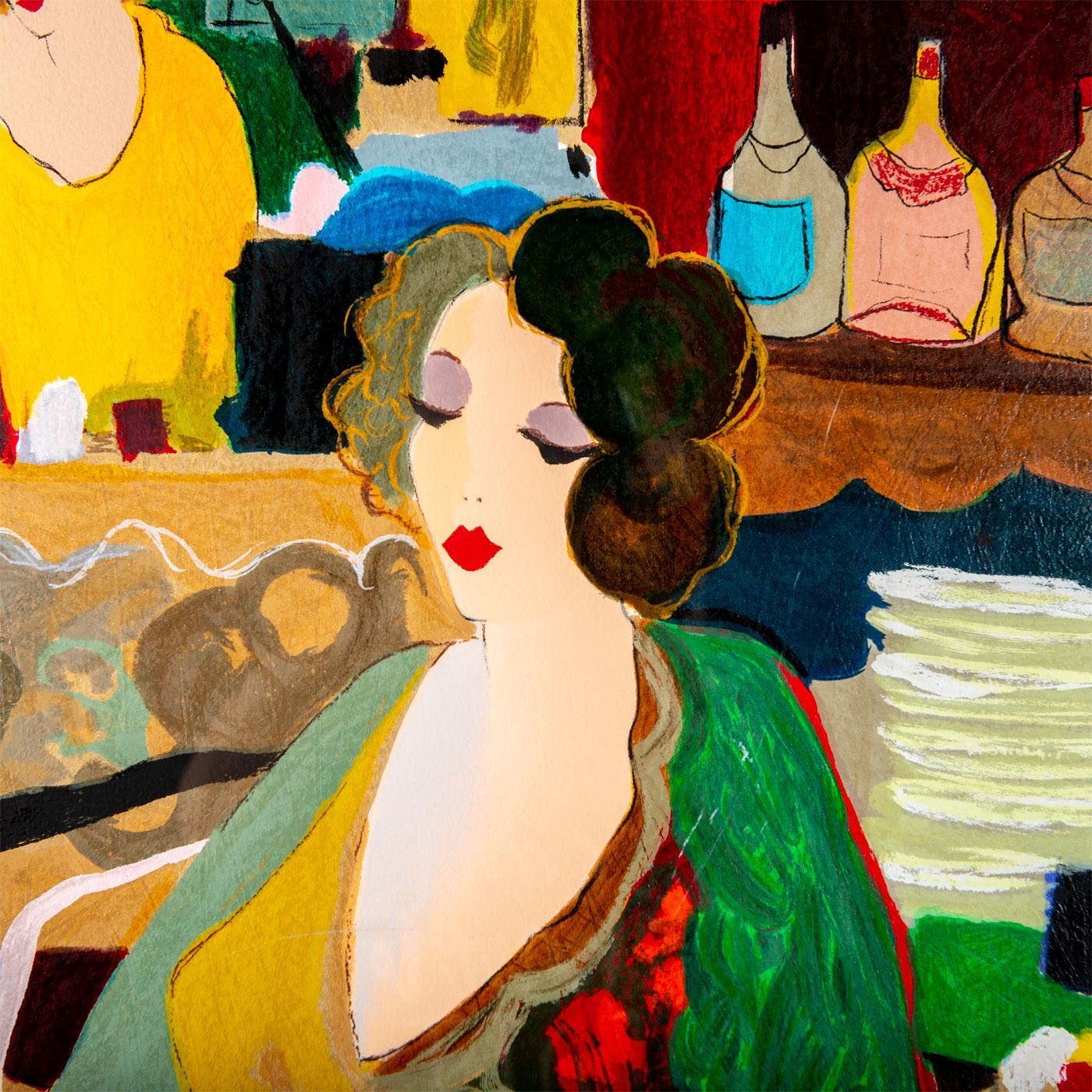 Limited edition; one of three pieces from Cafe Select series. Depicts lonesome woman in a colorful cafe. Signature in bottom right corner. Sight size: 40.5"H x 30"W. Frame size: 56"H x 45"W. Good condition. #tarkay #serigraph #cafeselect