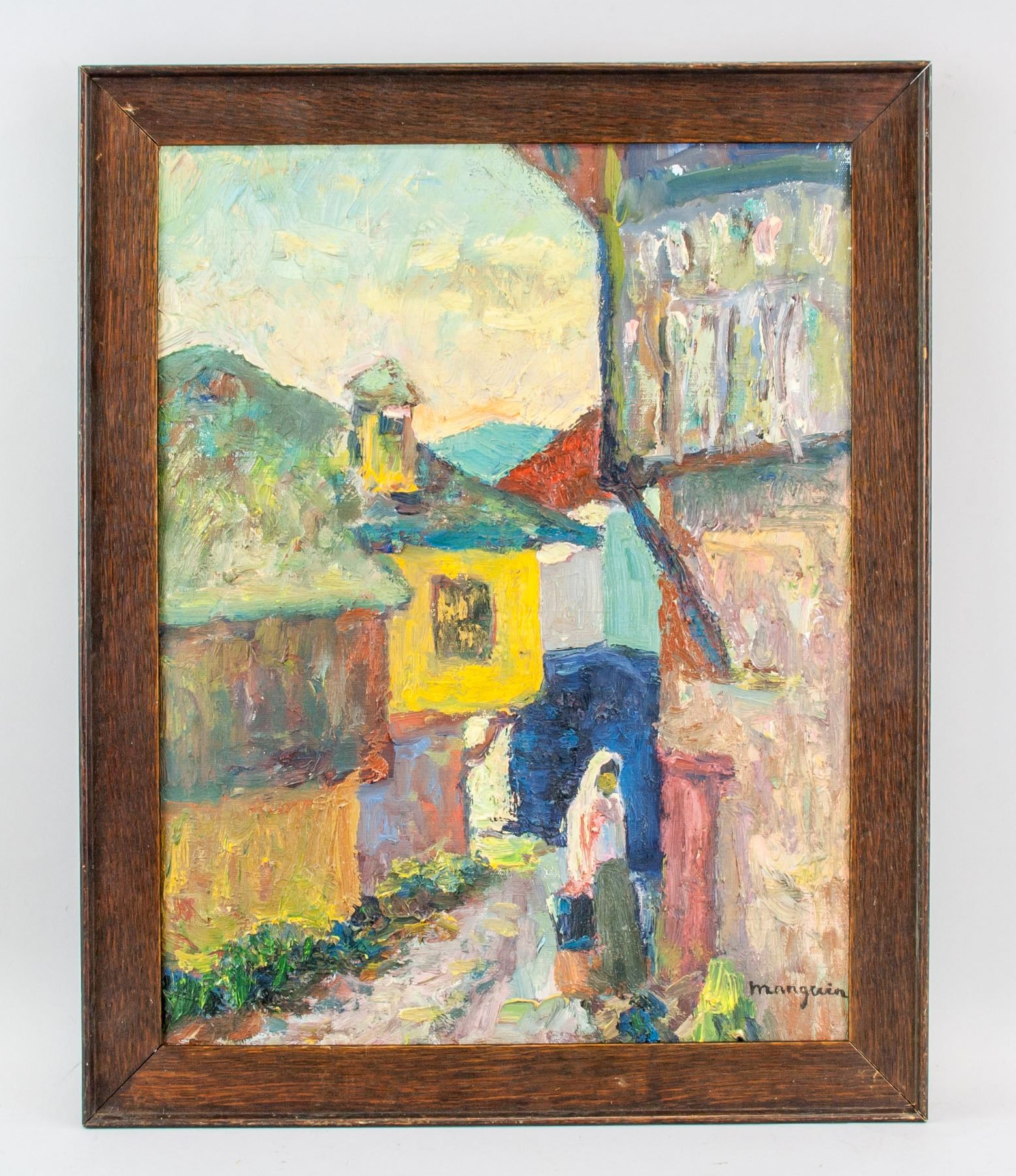 Oil on canvas. Featuring a Parisian alleyway. Signed Henri Manguin (French, 1874-1949). 17.1 x 13.2 inch (43.5 x 33.5 cm). Henri Charles Manguin was born in Paris in 1874 and died in Saint Tropez in 1949. He was a French painter associated with Fauve movement. Manguin studied at the Ecole des Beaux-Arts under Gustave Moreau alongside Matisse and Charles Camoin, who were to become close friends, and made many copies of the Renaissance art at the Louvre. His work was greatly influenced by impressionism, which is reflected in his frequent use of bright pastel colours. In 1899 he married and made a number of portraits of his wife Jeanne and their family. Manguin's first exhibition was in 1902 at the Salon des Independants and d'Automne. At the height of his career as a Fauve artist Manguin produced numerous paintings of Mediterranean landscapes. Manguin travelled extensively through Southern Europe with Albert Marquet. He left Paris to settle in Saint-Tropez in 1949 where he died soon after the same year. PROVENANCE: Southern Ontario estate