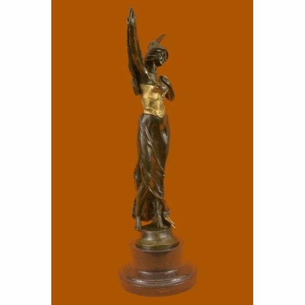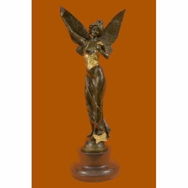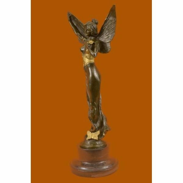 Daydreamers will fall in love with this daydreaming fairy. She wanders around  the mystical forest, her eyes taking in all the magic around her. She is lulled  by the soft sounds of life and fantasy around her. With youthful innocence she  giggles with glee. Her fairy wings arch behind her. She wears a brown and gold patina  dress. This would make a sweet addition to any little girls room. 100% bronze  and handmade, this sculpture was cast using the "Lost Wax Method" and mounted on  a marble base and is signed Renaud.                            Condition:   This sculpture is in perfect condition.         Bronze Dimensions with Marble Base:Height 20" x Width 8"   Marble Dimensions:Diameter 6"   Height without base: 16.5                    "    Weight :15 LBS   Inventory :   37XNCH2265G8873