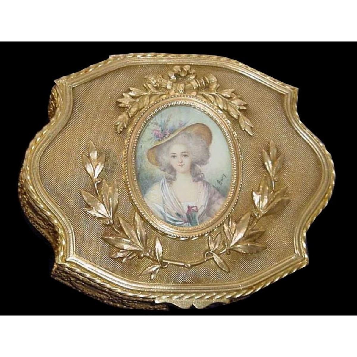 Miniature French signed painting bronze dore jewel box. 5" antique gorgeous gilt dore bronze jewel casket box, complete with filigree mount. Miniature painting on top depicting the portrait of a beautiful younglady. Protected with glass.