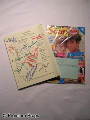 Lot of 2 great soap opera pieces, including an original cast signed script from the classic soap "General Hospital," episode #7919 which aired March 11, 1994. The cover page includes 11 signatures. Also included in this lot is the Australian publication "Inside Soap." Proceeds to benefit This Close for Cancer Research.