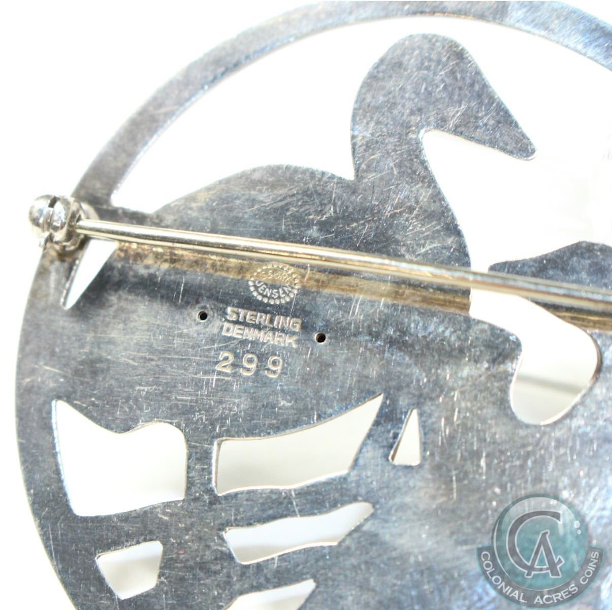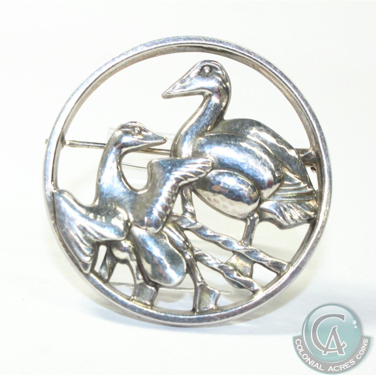 Signed Georg Jenson Denmark Sterling Silver 'Two Ducks' Brooch. Measures Just over 2" in diameter. Contains a hand hammered finish and designed by Danish sculptor Hugo Liisburg.