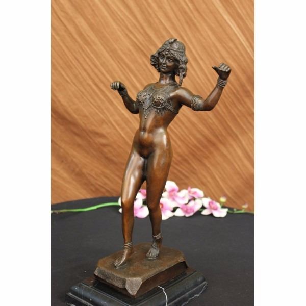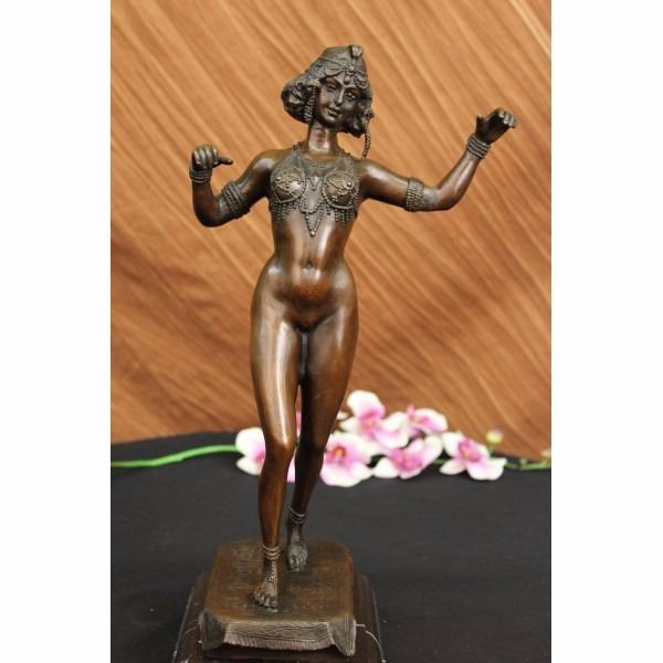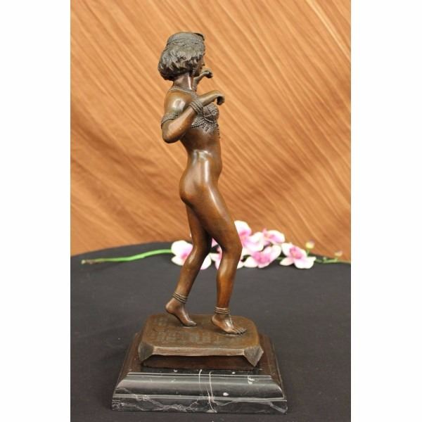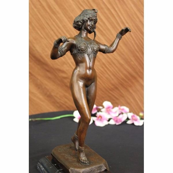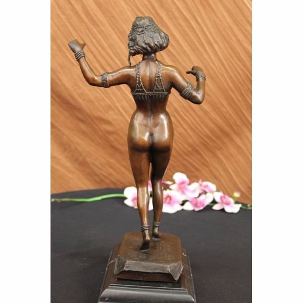 She is carefree, sensual, and effortlessly sexy. This European dancer is dressed in a fanciful bra-top and matching dress leaving her semi-nude. She stands on the balls of her feet with her arms artistically outwards. This medium sized bronze statue is sensuous, classy and beautiful. It stands on a black marble base. It was crafted using the lost wax method. It is signed F. Preiss. Condition: Height without base: 16" This sculpture is in perfect condition. Bronze Dimensions with Marble Base:Height 17" X Width 8" Marble Dimensions: 8" X 5 1/2" Weight : 15 LBS Inventory : 63DS5015736