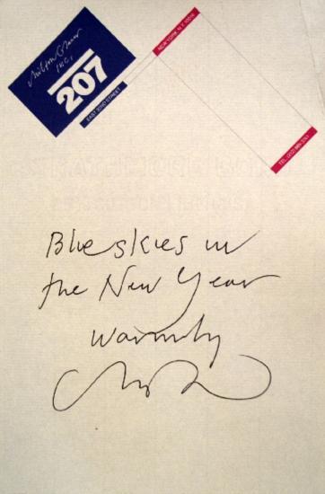 Reference #: ULEF1027-B Artist Name: Glaser, Milton Title: Blue Skies With the New Year Medium: Lithograph Edition Size: limited Year: Unknown Paper Size: 9 x 6 inches Image Size: 9 x 6 inches Condition: A: Mint Notes: Hand written note from Milton Glaser, reads Blue Skies in the New Year, signed by the artist.