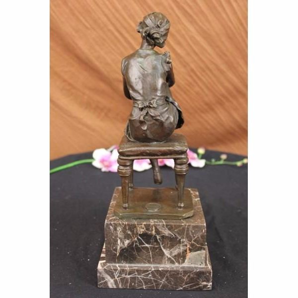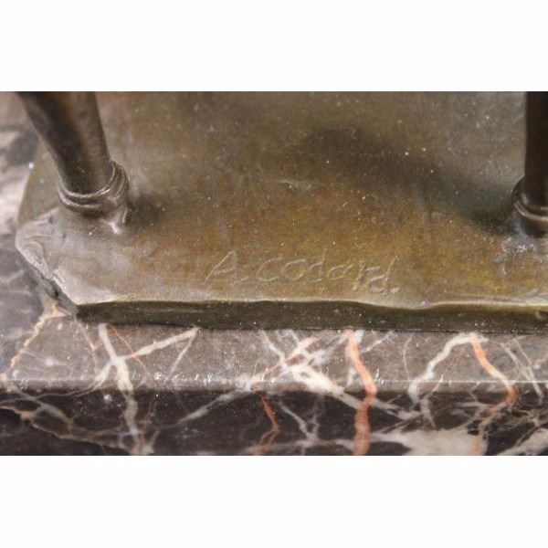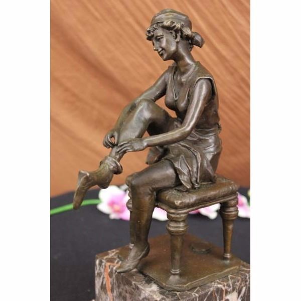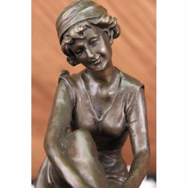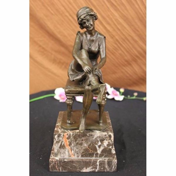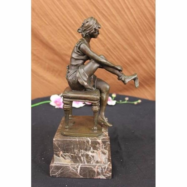 This stunning beauty sits on her nice room decorative chair as she finishes getting dressed. She smiles gracefully with a look of peace. She lifts her right leg up so she can put on her stocking on and follow it with her outfit shoe. She wears a one piece shorts body suit and a cute little hat to match with her adorable curls. This sculpture was casted using the ancient old "Lost Wax Method" stained in brown patina. 100% handmade and 100% bronze, mounted atop a off Brown marble base, signed by A, Godard. Condition : This sculpture is in perfect condition Bronze Dimensions with Marble Base:Height 14" x Width 6" Marble Dimensions: 6" X 6" Height without base: 10" Weight : 16 LBS Inventory : 76X23425267