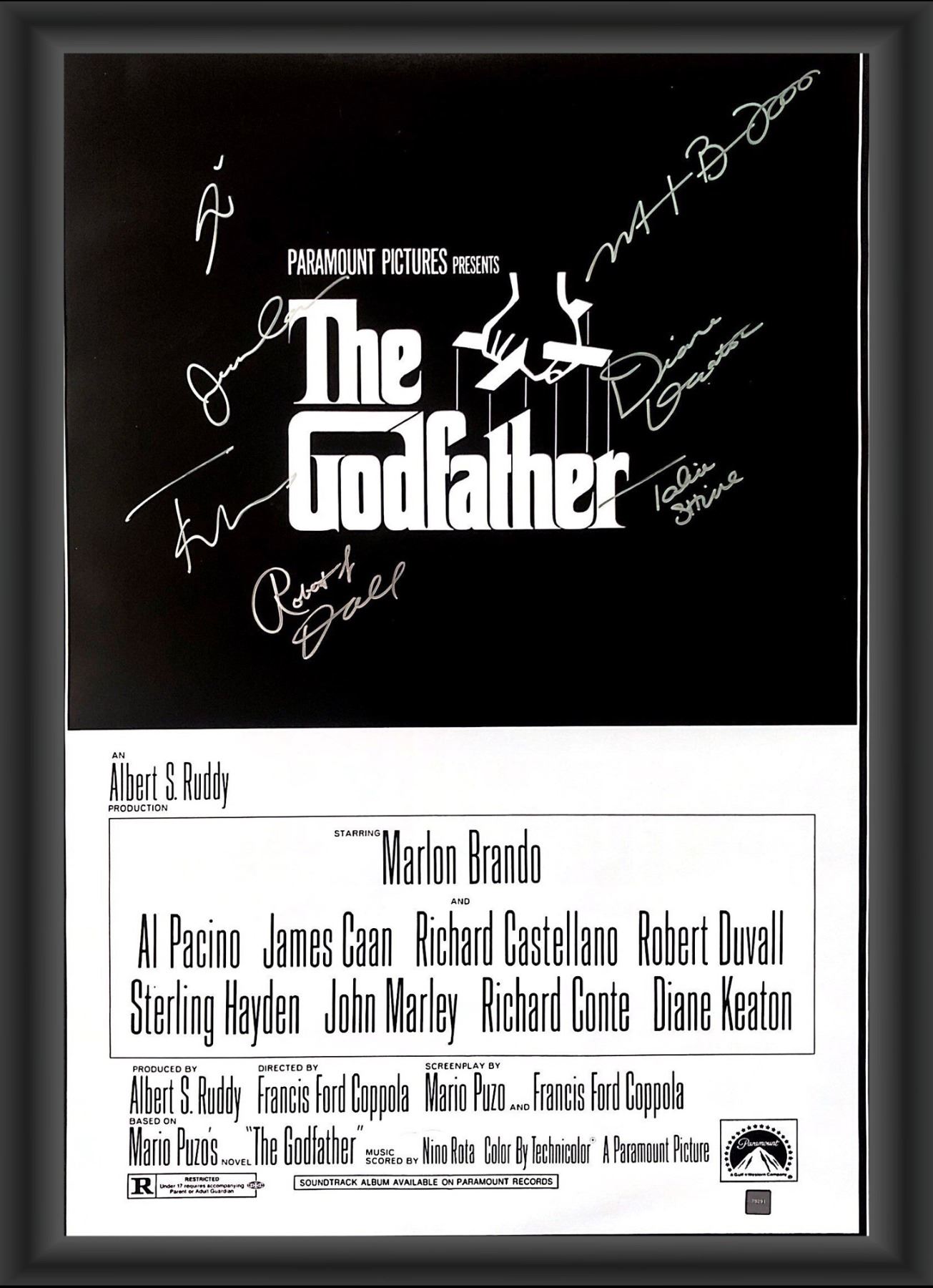 Autographed by Al Pacino, Robert De Niro, Diane Keaton, James Caan, Talia Shire, Robert Duvall and Francis Ford Coppola