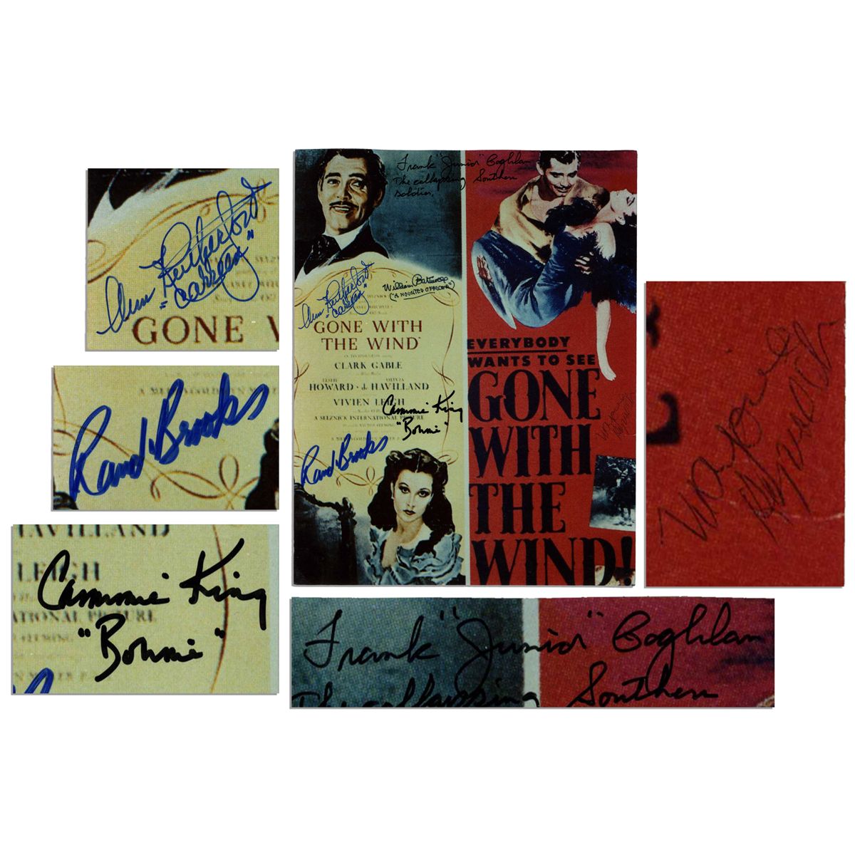 ''Gone With The Wind'' photo signed by six members of its cast. Photo of two promotional designs for the film is signed: ''Frank 'Junior' Coghlan / The collapsing Southern soldier''; ''Ann Rutherford / 'Carreen'''; ''William Bakewell / ('A Mounted Officer')''; ''Cammie King / 'Bonnie'''; ''Rand Brooks'' and ''Marjorie Reynolds''. Glossy photo measures 8'' x 10''. Near fine.