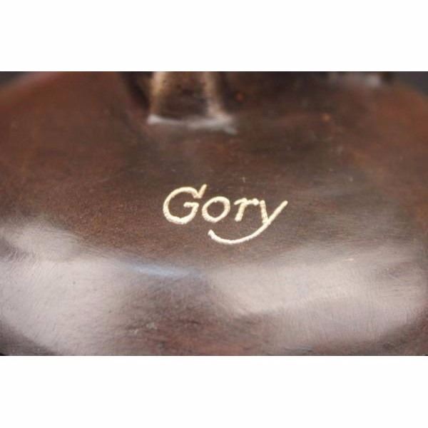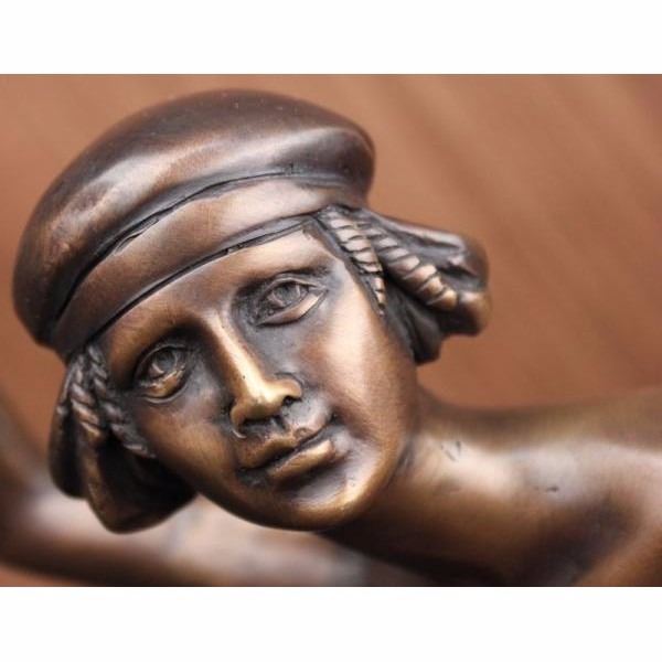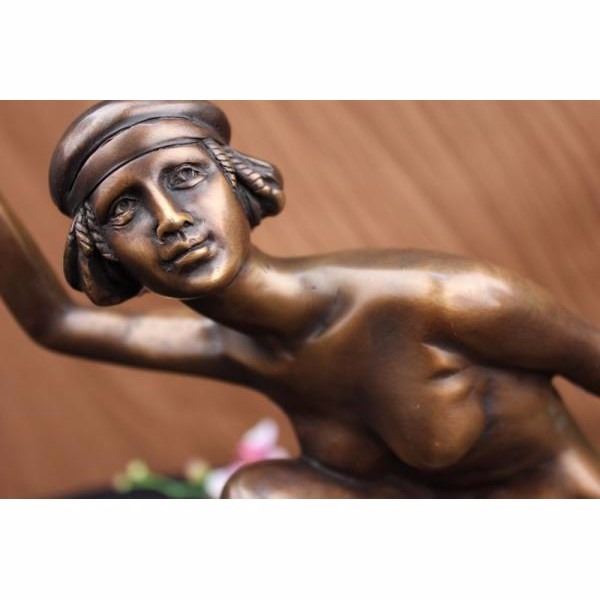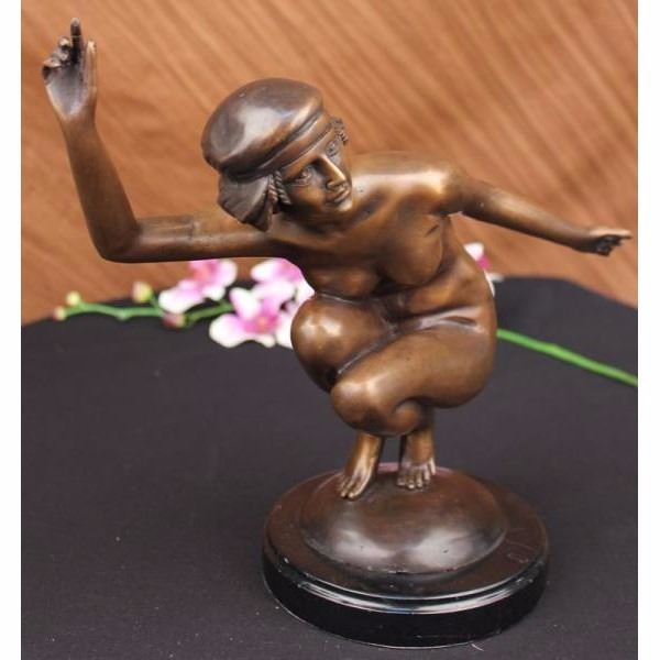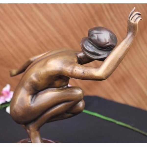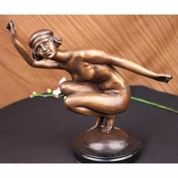 This gorgeous nudist performs for a crowd of men and some woman. She bends down on the tips of her toes and balances her body weight on just her feet. She wears nothing but an old fashion French beret that is placed over her nicely comb short hair. The amazing details on this woman's face is astonishing, her features or gorgeous from her eyes she show a deep sorrow, yet her graceful smile gives you the impression that she loves what she does. While she is on bended knees her right arms is slightly bend and pointed upwards, and her left arm is place to her side and behind her. This statue was cast using the ancient old "Lost Wax Method" stained in brown patina finish for preservation. She is 100% handmade and 100% bronze, mounted atop a black marble base, with A.Gory's signature. Condition: This sculpture is in perfect condition. Bronze Dimensions with Marble Base:Height 12" x Width 14" Marble Dimensions: diameter 6" . Height without base: 11" Weight : 12 LBS Inventory 54-74458M7045
