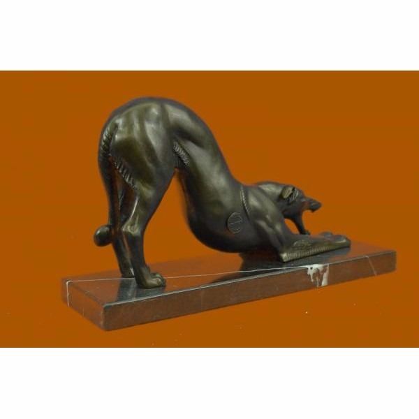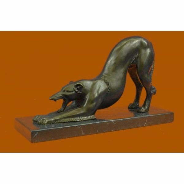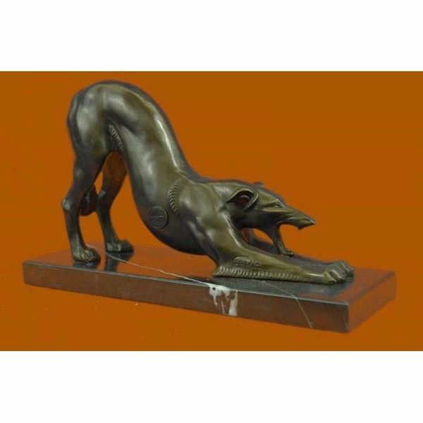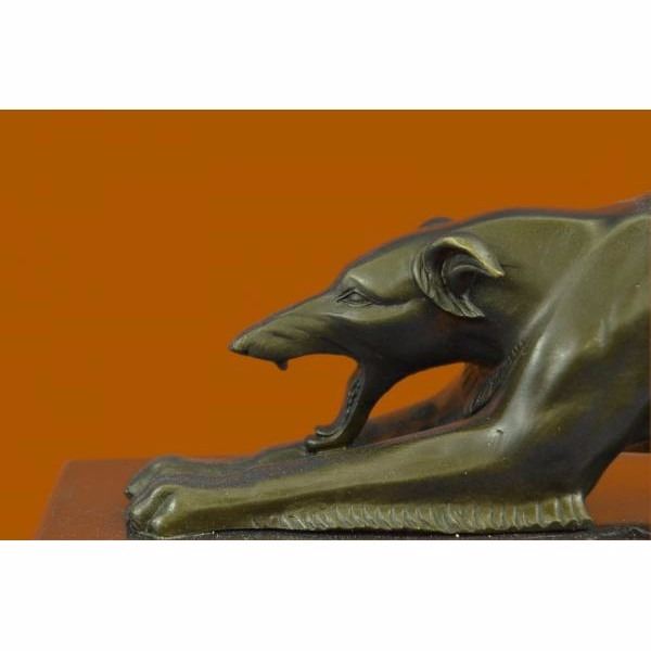 Hunched in down this cute Greyhound reveals a low feral growl. His mouth gapes open bearing his sharp teeth to his prey, instilling anticipation and fear. The dog's flexible lean body is beneficial in his hunt. His hind is pressed to the sky. He is ready to pounce. This sculpture was crafted using the lost wax method. It rests on a black marble base. It is signed Carvin. Condition: This sculpture is in perfect condition. Bronze Dimensions with Marble Base:Height 6 1/2" x Width 10" Marble Dimensions: 10" X 3". Height without base: 6" Weight : 7 LBS Inventory:28K3404382