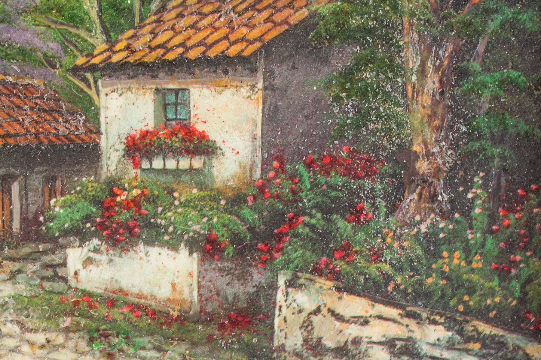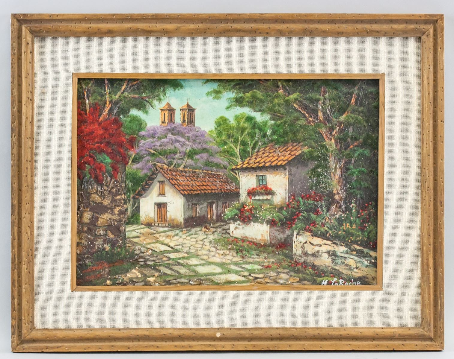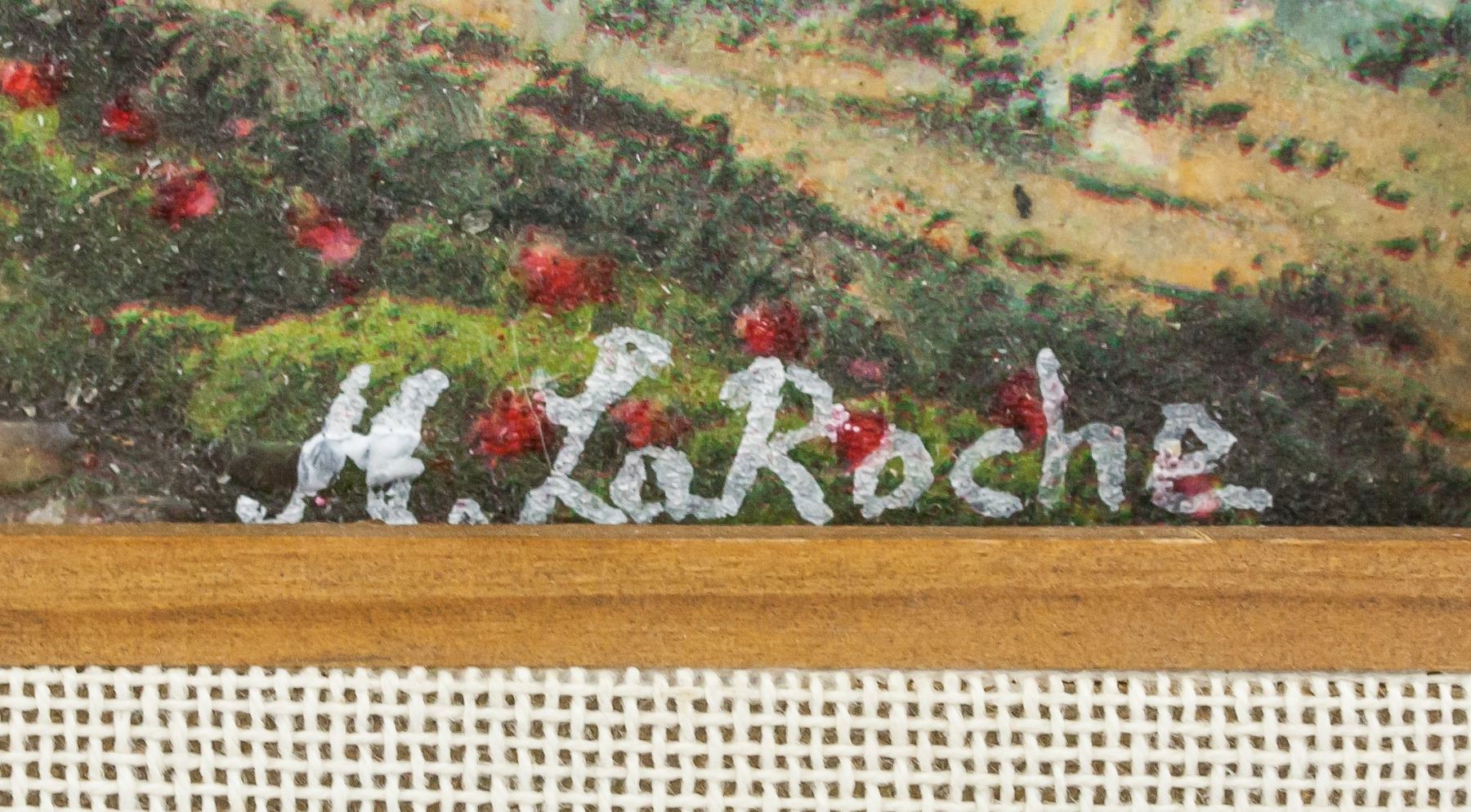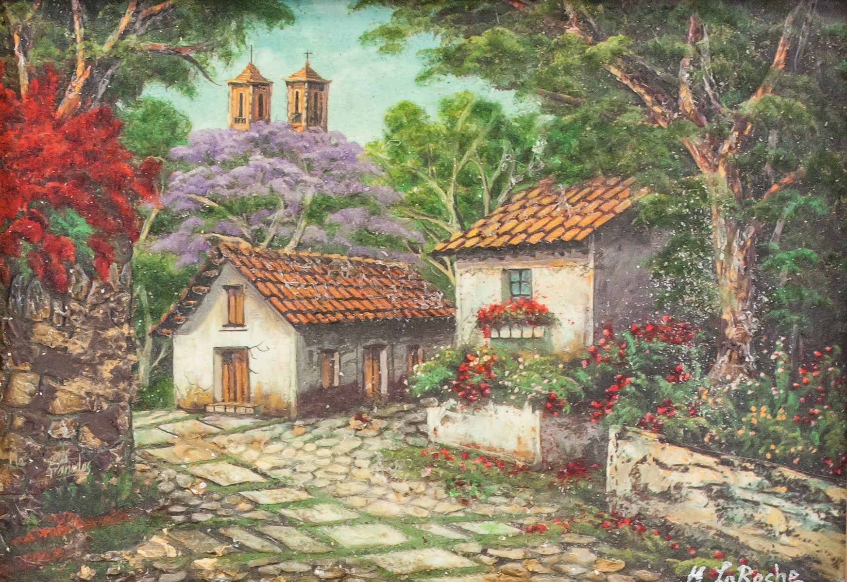 Oil on board, framed. Featuring rustic landscape scene with red-roofed cottages. Signed "H. LaRoche" in the bottom right corner. 27 x 38 cm (10.5 x 15 in), Frame: 43 x 55 cm (17 x 21.5 in)
