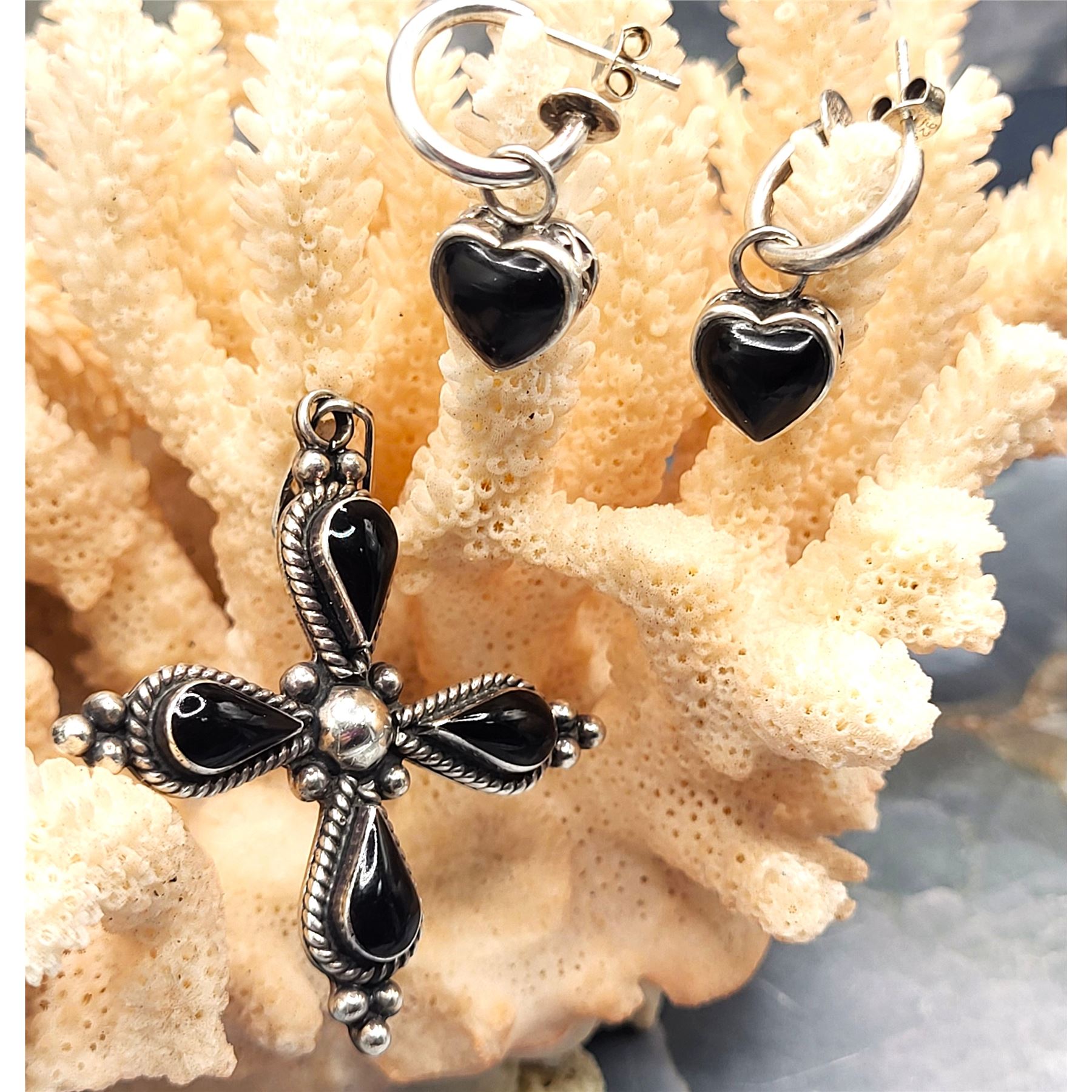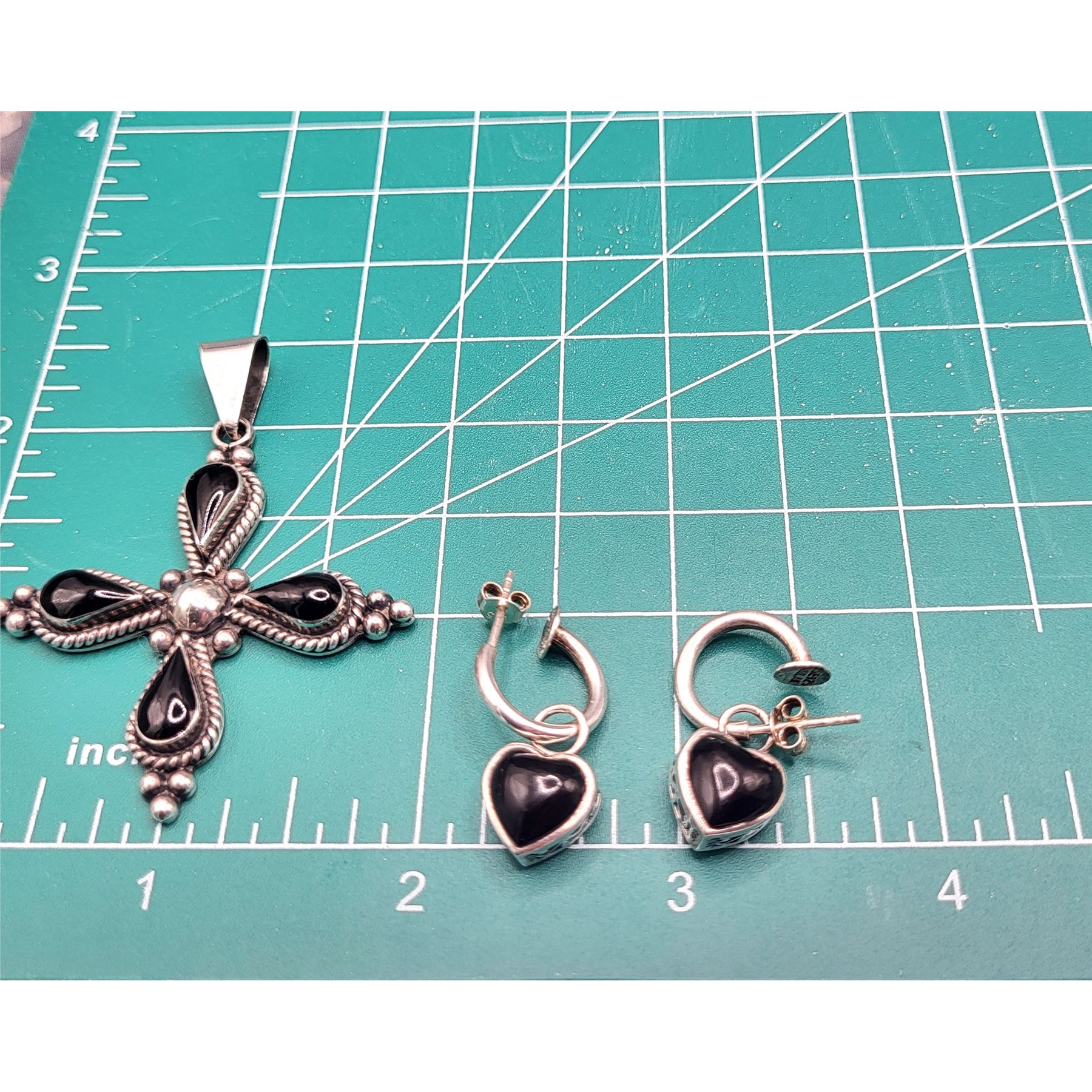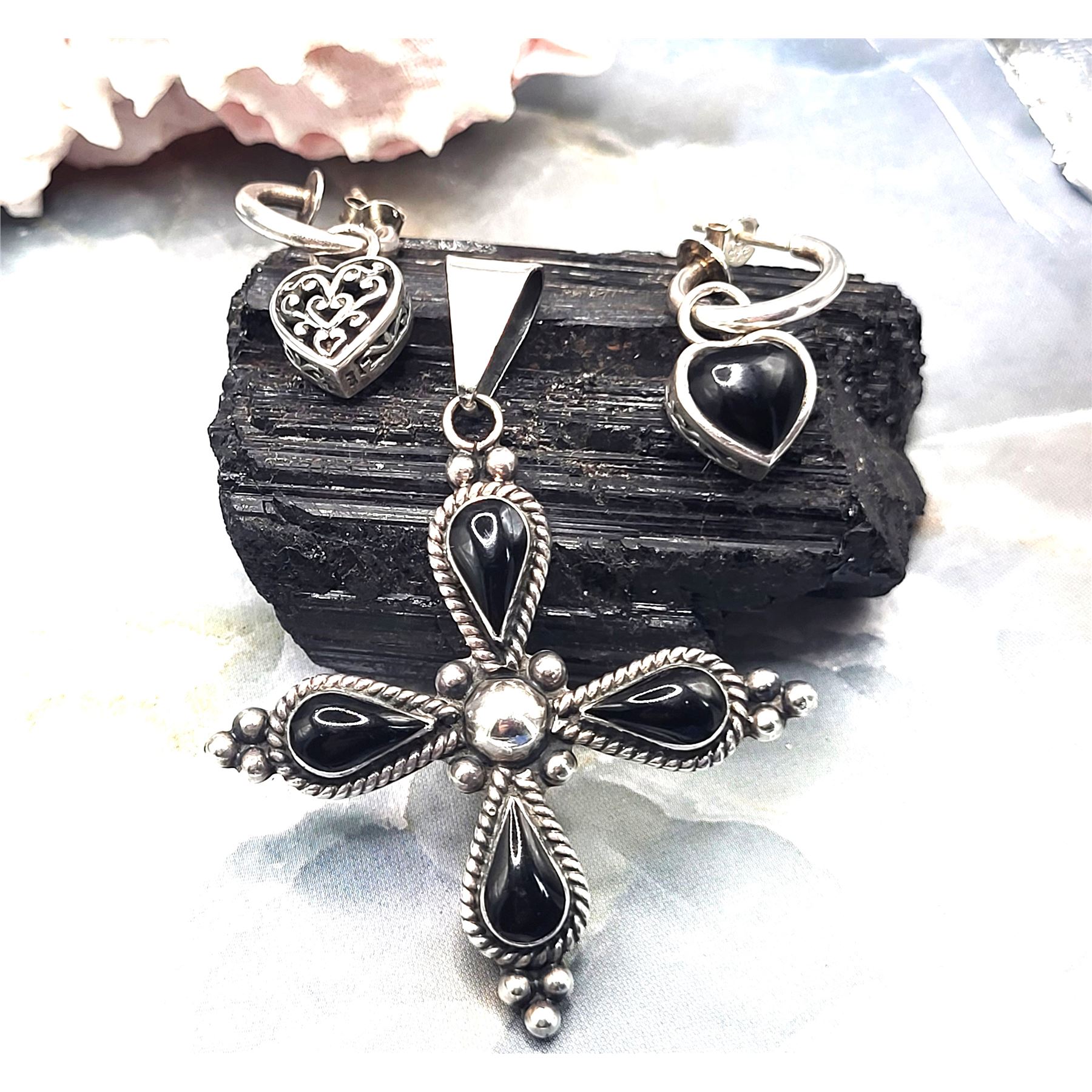 Signed HOB for House of Bangles, Mexico, sterling silver cross pendant features four polished, teardrop-shaped black onyx with sterling silver bead accents and a solid back gallery.& nbsp; A solid bail that is attached to a jump ring can accommodate up to an approximate 5.25mm chain.& nbsp; The bonus earrings are REVERSIBLE! They are sterling silver half hoops, marked SE Thaniland, with heart-shaped, polished black onyx in the front and beautiful scrollwork on the back with reticulated galleries in between. The earrings attach to the earlobes with posts and butterfly backs and have a flat stop plate to prevent the heart from sliding off. .Admin: K33/