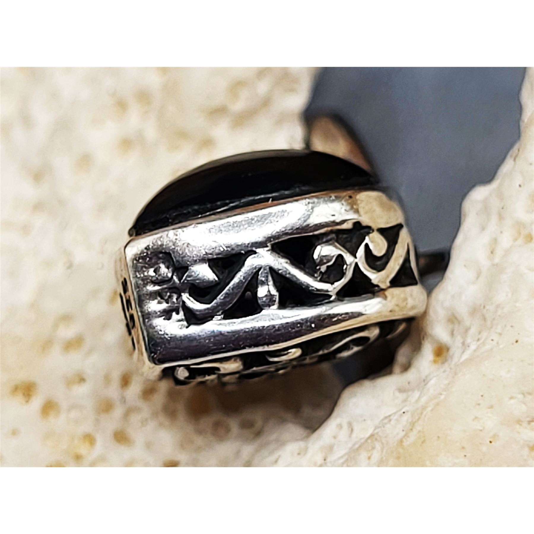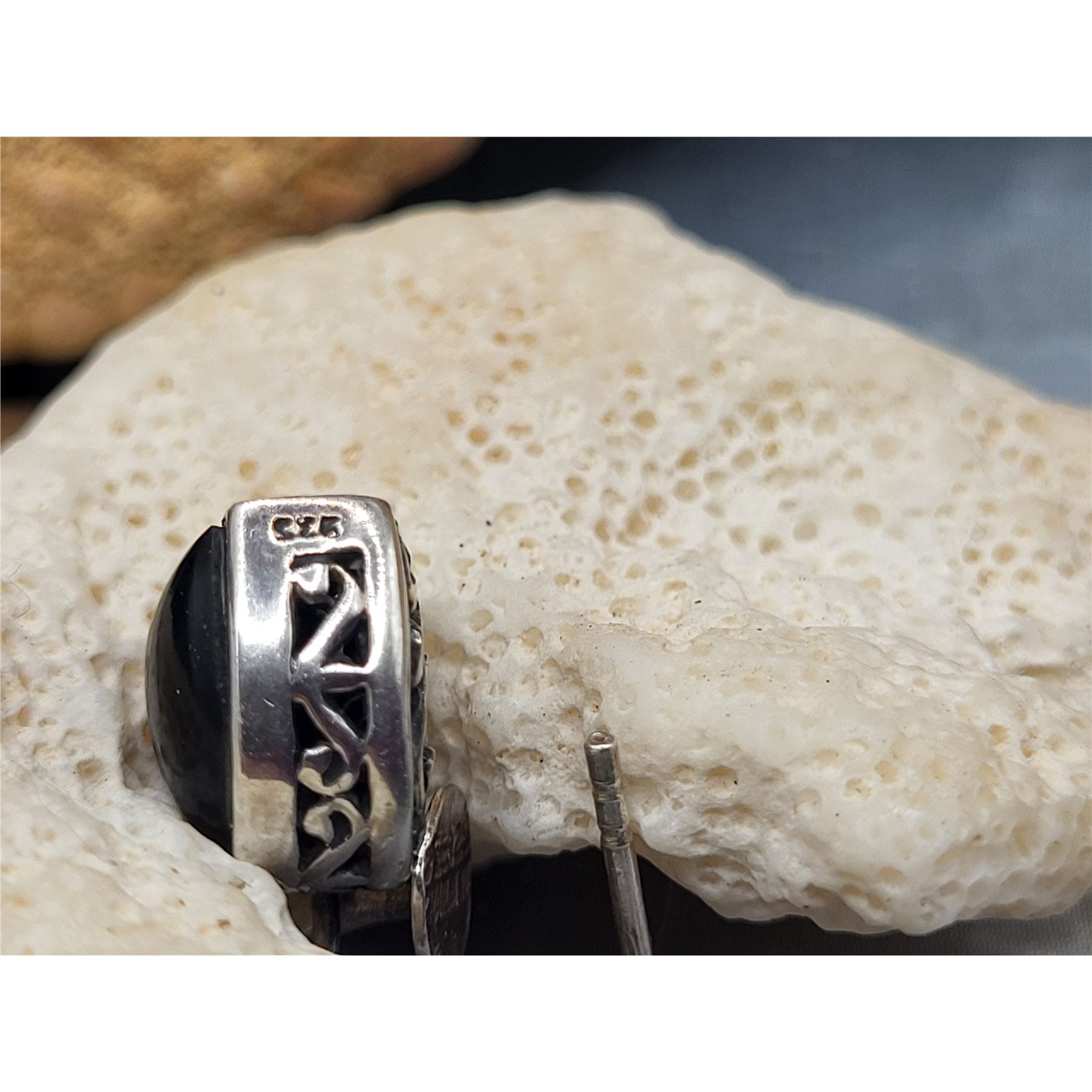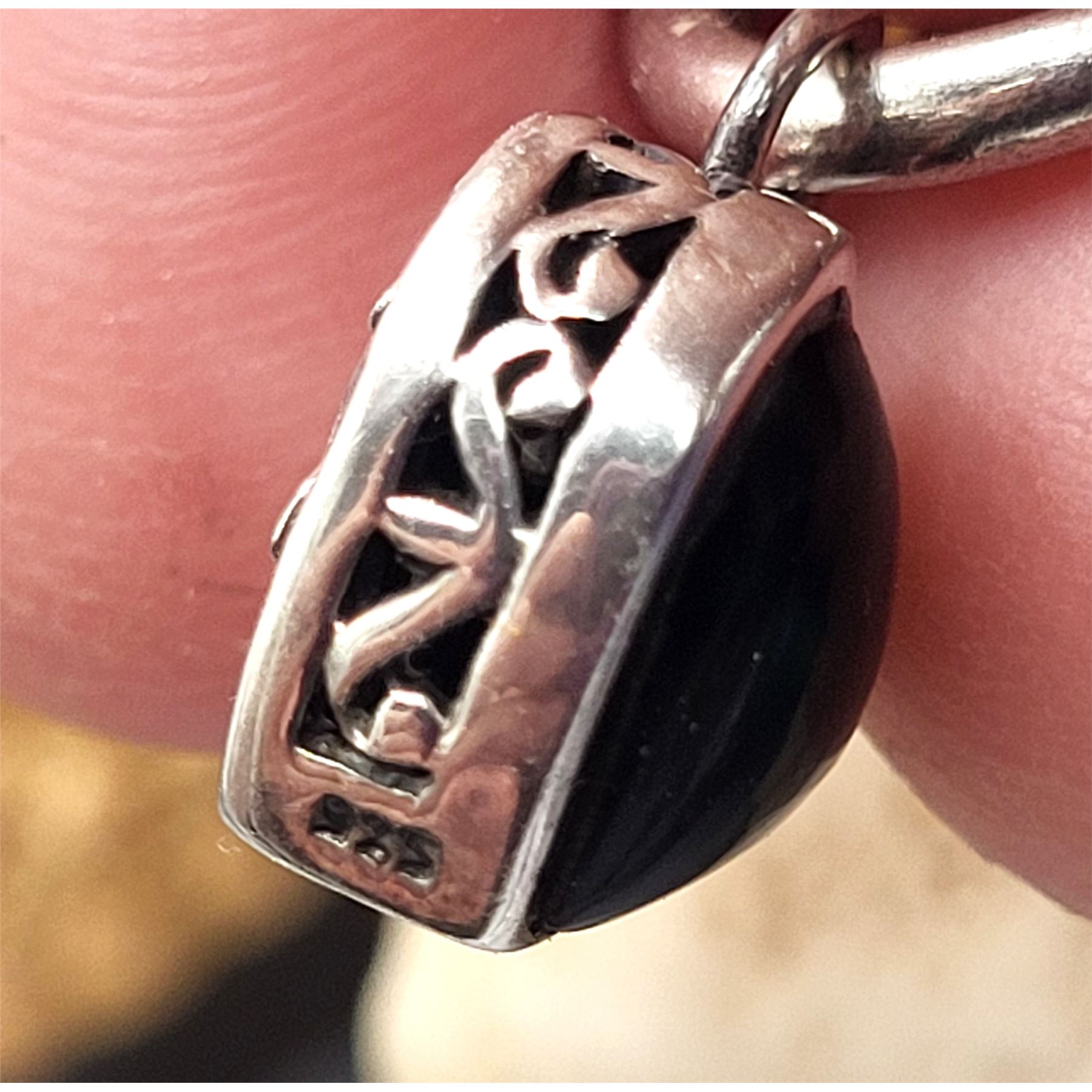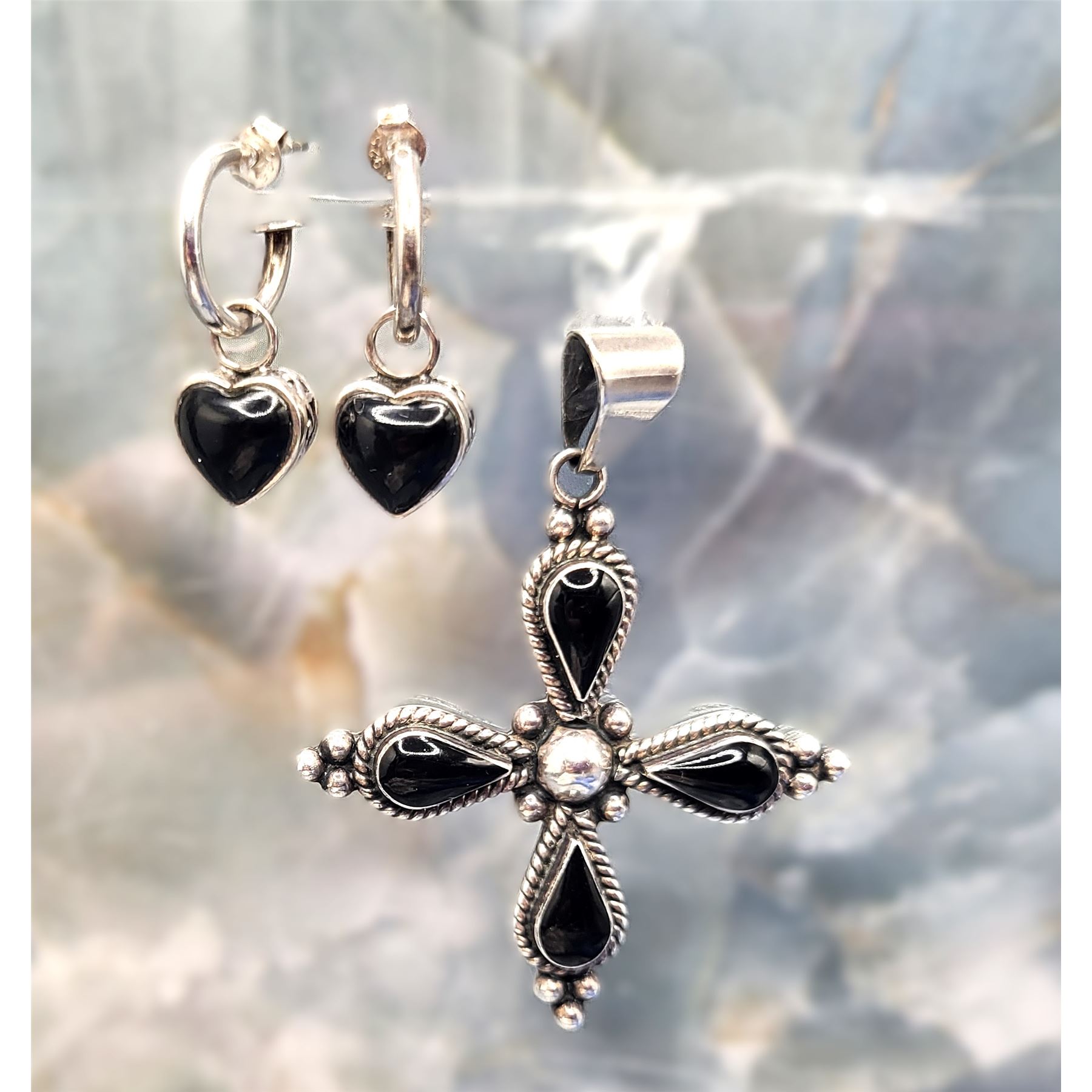 Signed HOB for House of Bangles, Mexico, sterling silver cross pendant features four polished, teardrop-shaped black onyx with sterling silver bead accents and a solid back gallery.& nbsp; A solid bail that is attached to a jump ring can accommodate up to an approximate 5.25mm chain.& nbsp; The bonus earrings are REVERSIBLE! They are sterling silver half hoops, marked SE Thaniland, with heart-shaped, polished black onyx in the front and beautiful scrollwork on the back with reticulated galleries in between. The earrings attach to the earlobes with posts and butterfly backs and have a flat stop plate to prevent the heart from sliding off. .Admin: K33/